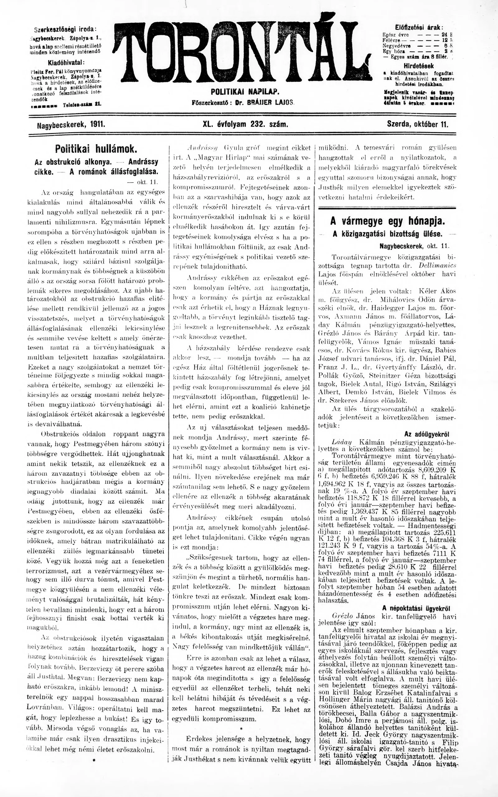 Torontál, 40. évf. 1911. október 11. 232. sz.