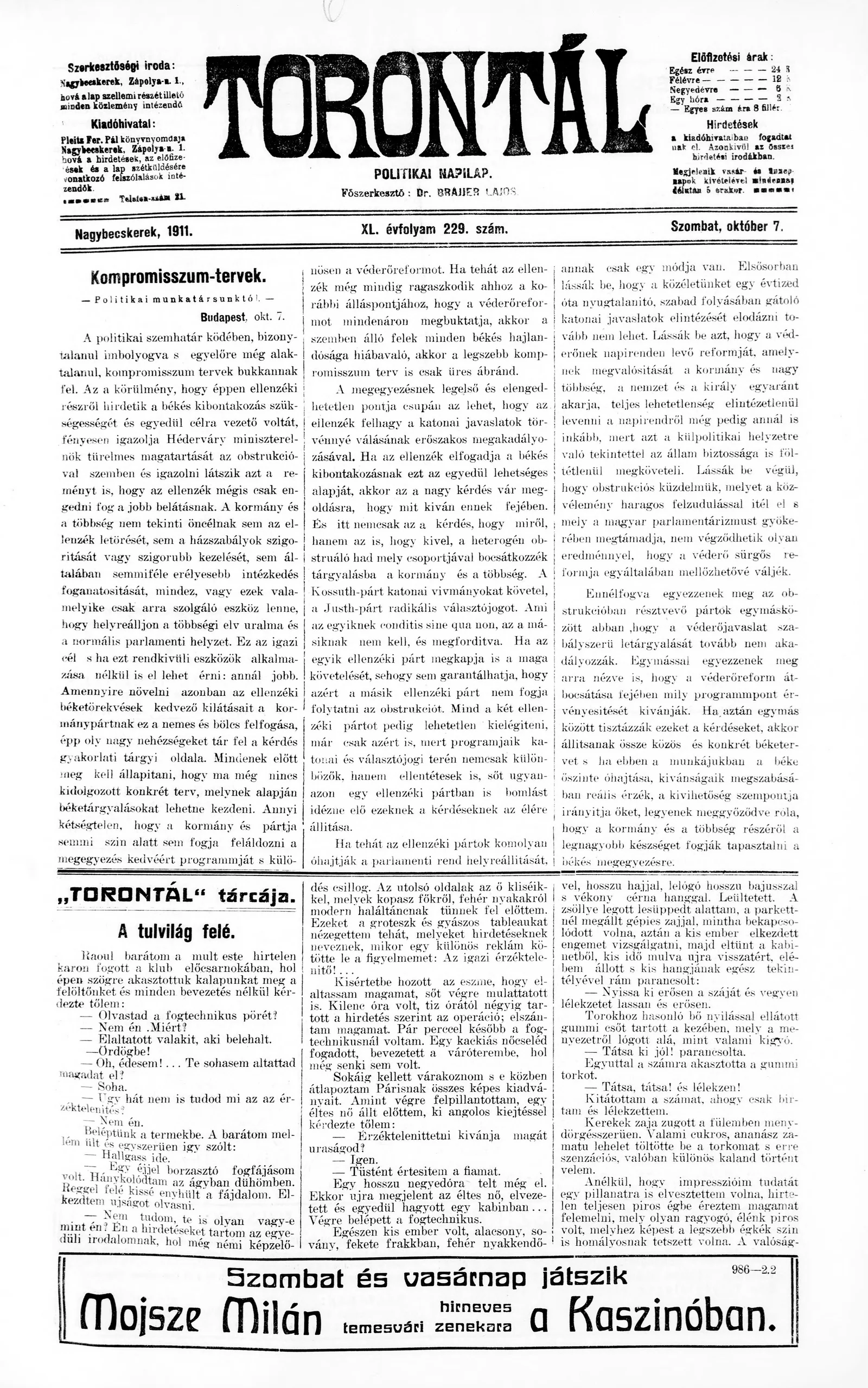 Torontál, 40. évf. 1911. október 7. 229. sz.