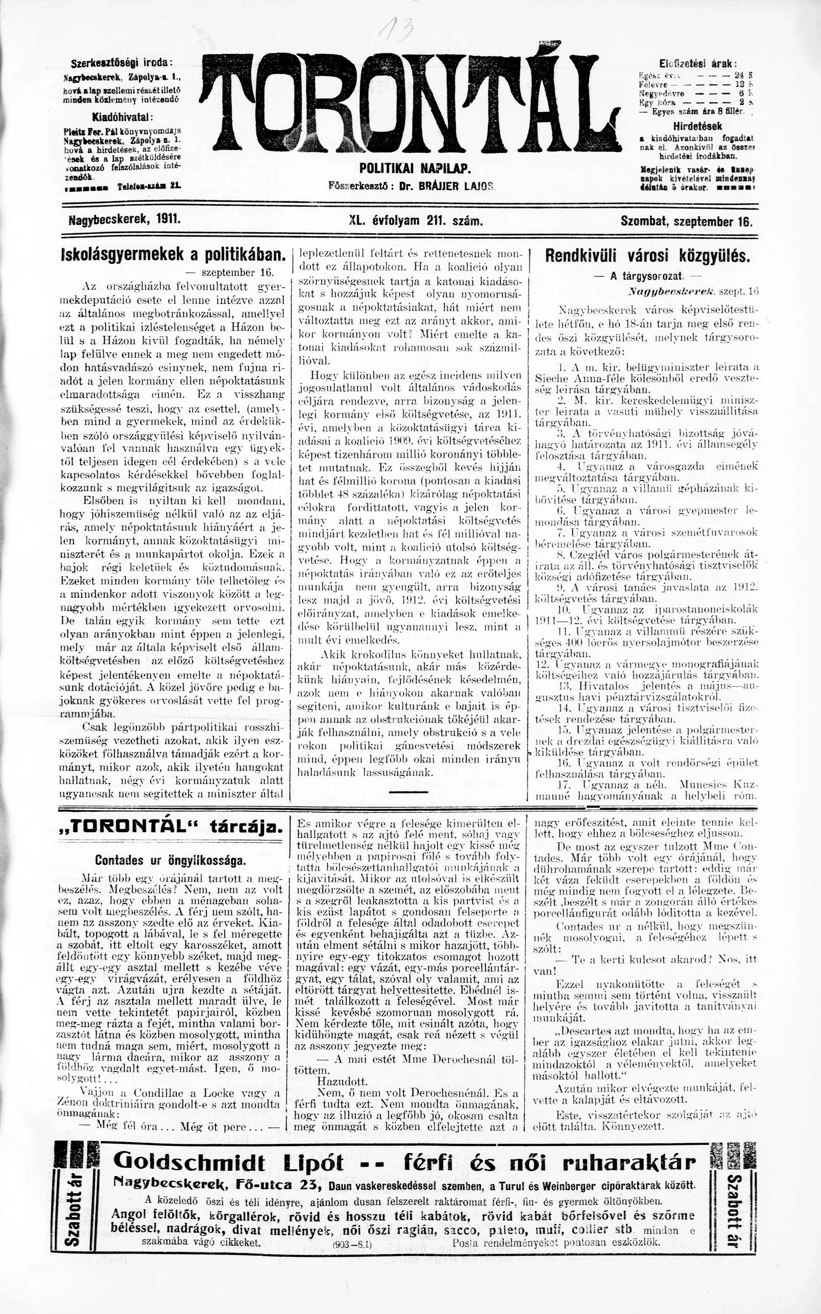 Torontál, 40. évf. 1911. szeptember 16. 211. sz.