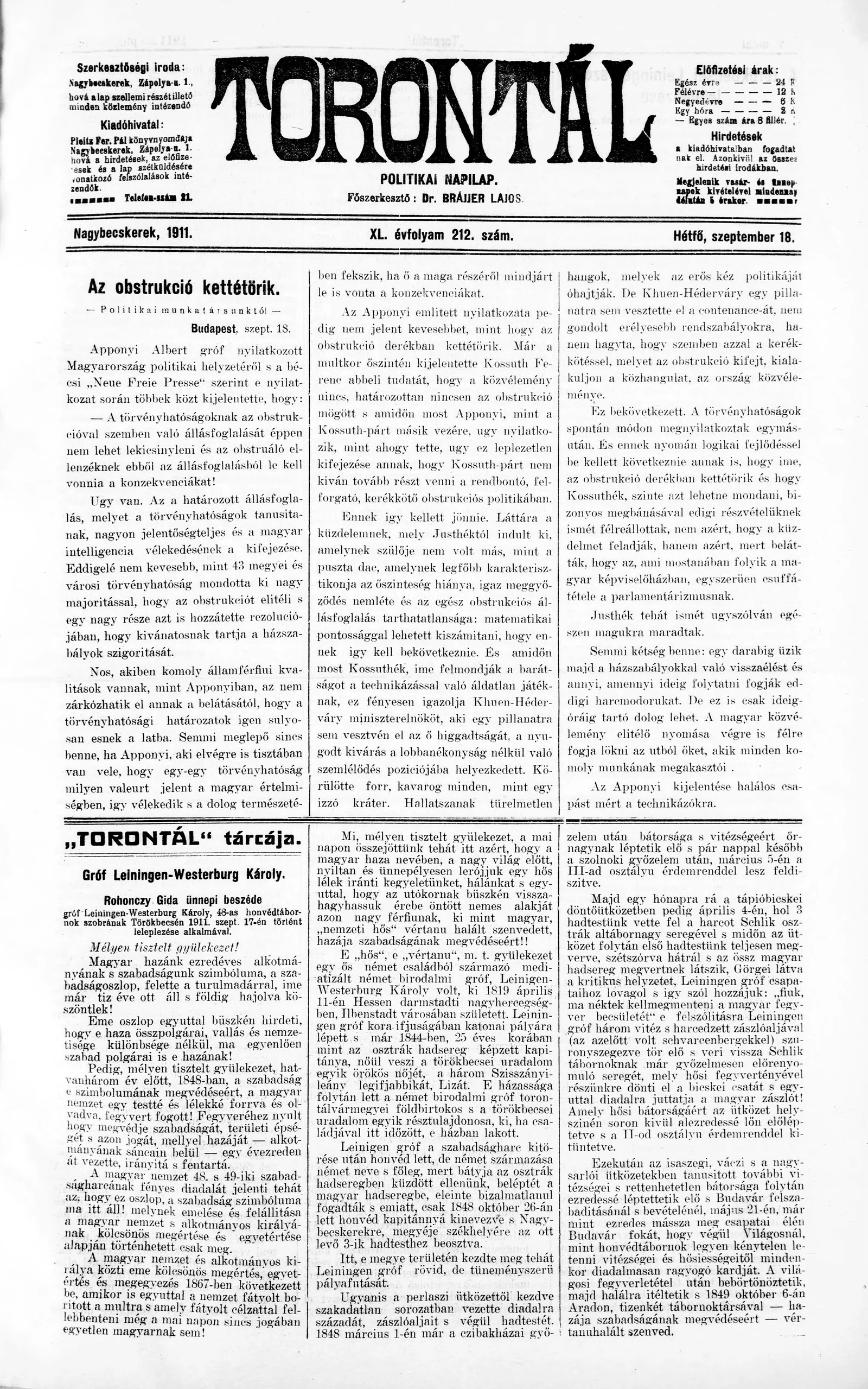 Torontál, 40. évf. 1911. szeptember 18. 212. sz.