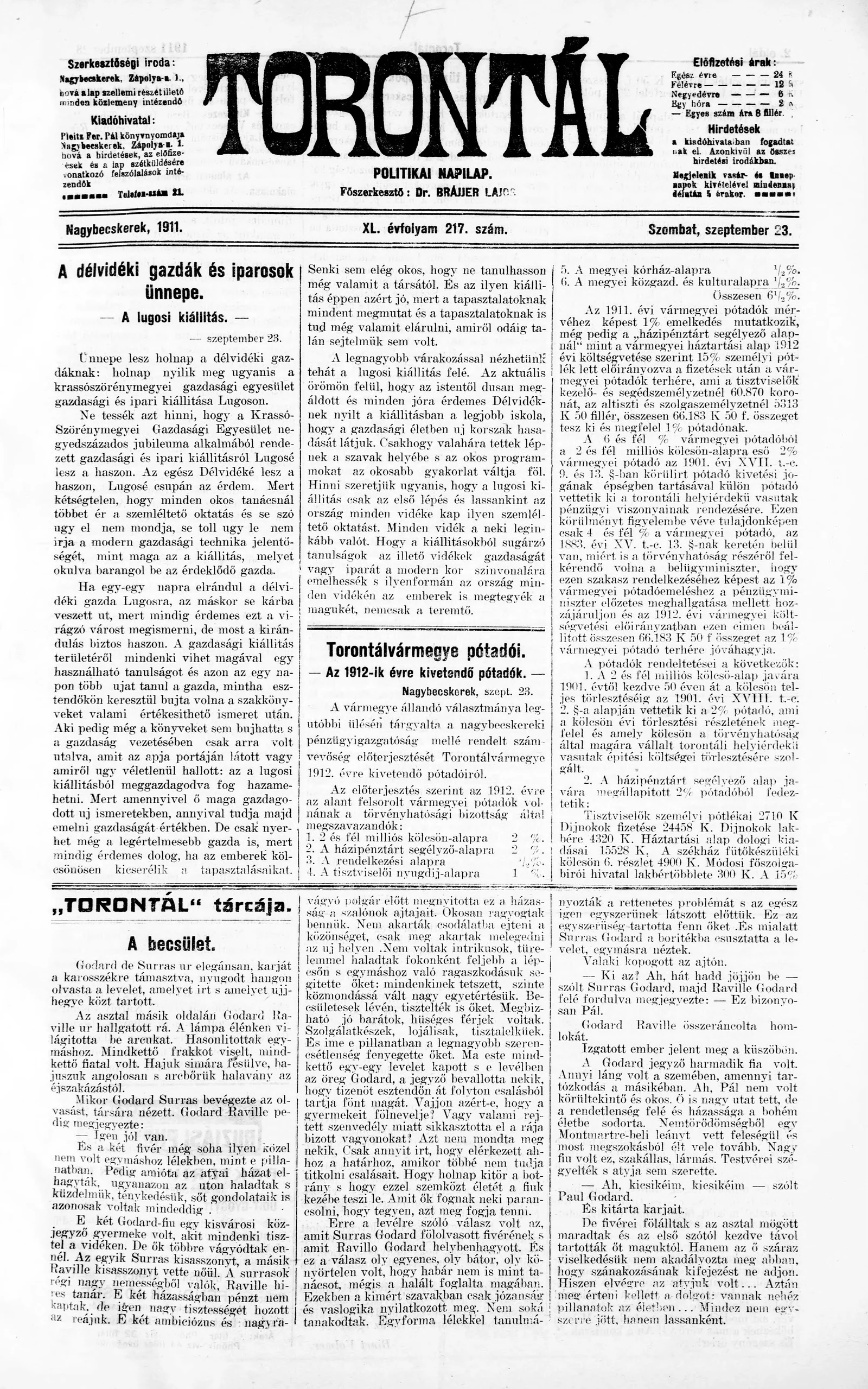 Torontál, 40. évf. 1911. szeptember 23. 217. sz.