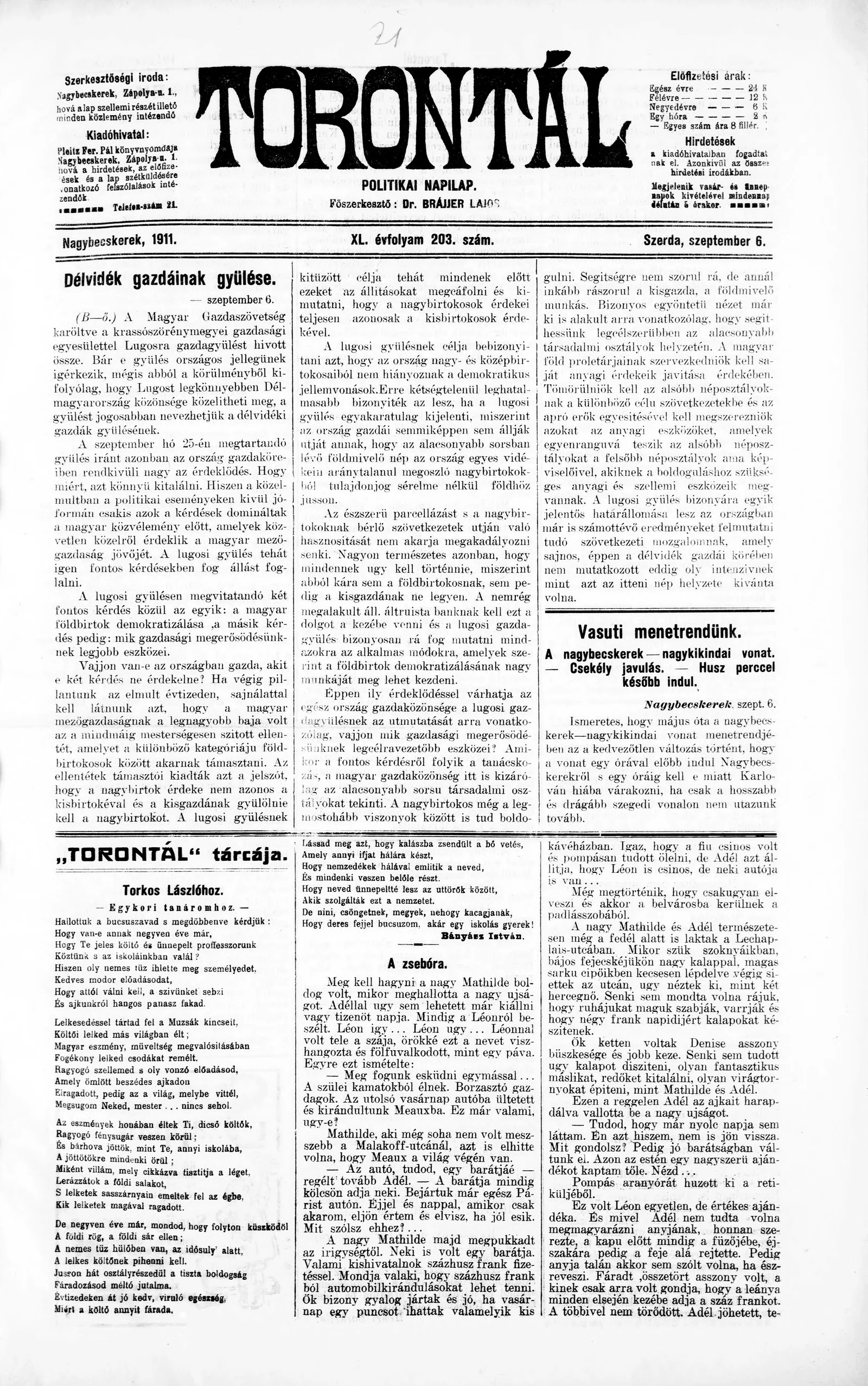 Torontál, 40. évf. 1911. szeptember 6. 203. sz.