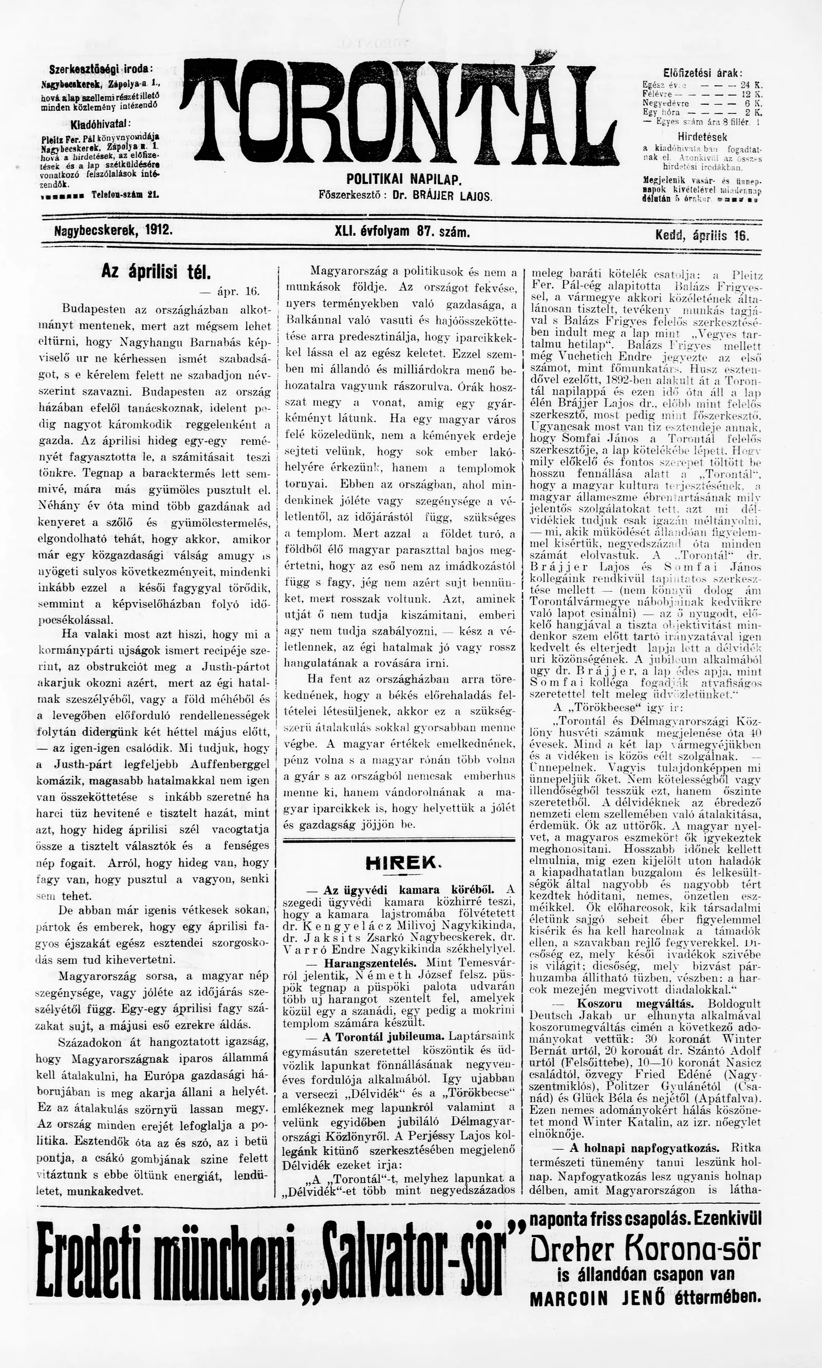 Torontál, 41. évf. 1912. április 16. 87. sz.