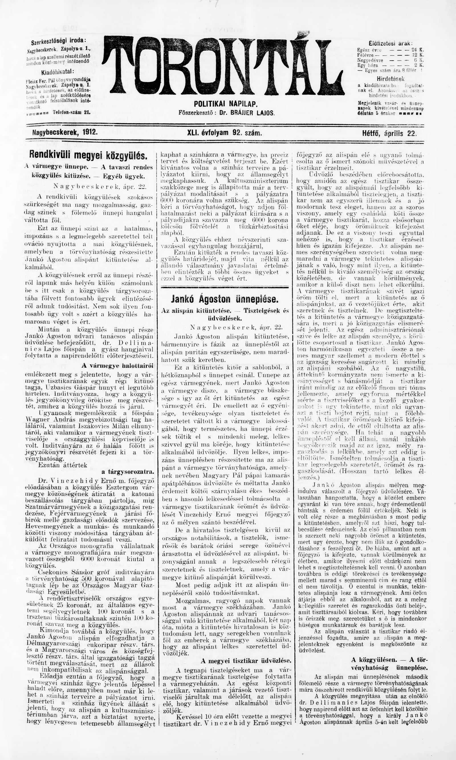 Torontál, 41. évf. 1912. április 22. 92. sz.