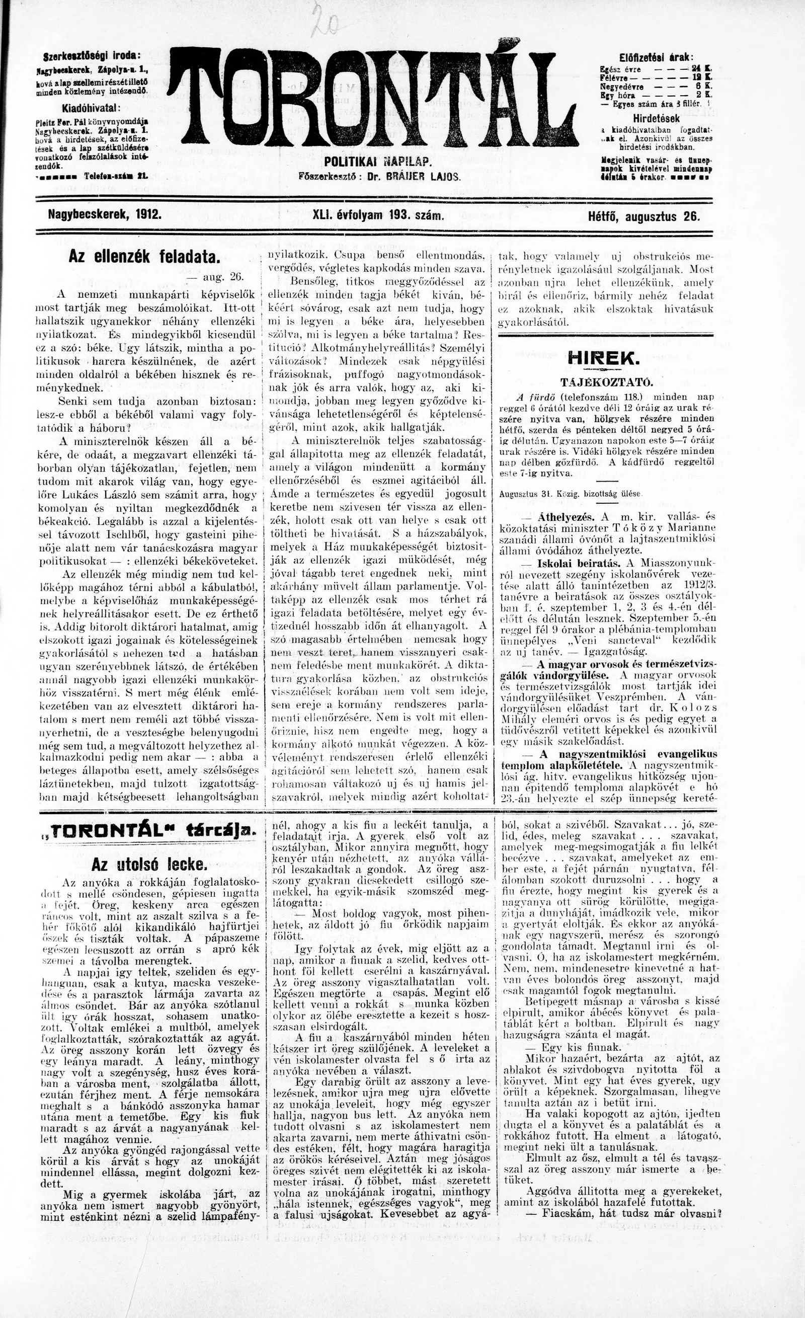 Torontál, 41. évf. 1912. augusztus 26. 193. sz.