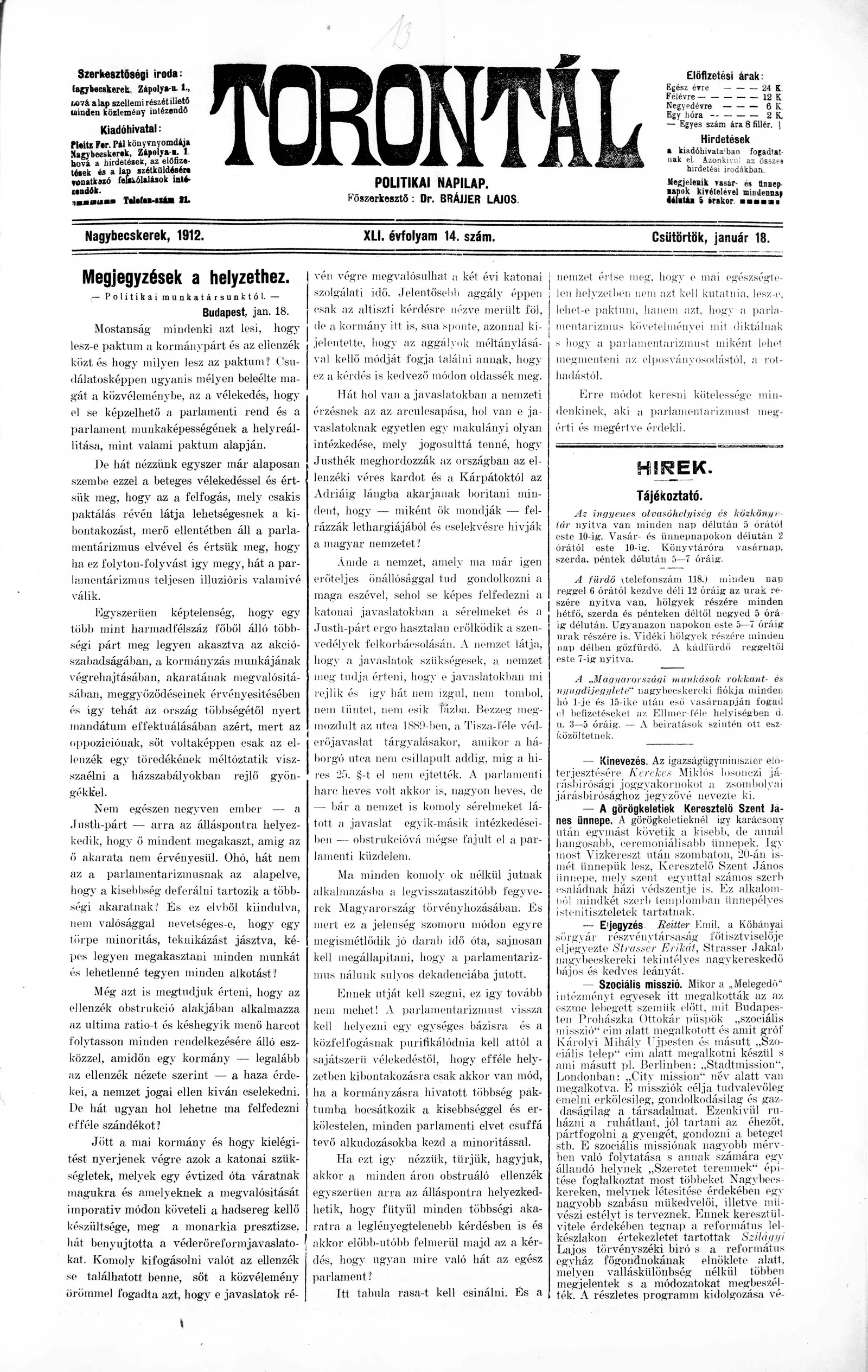 Torontál, 41. évf. 1912. január 18. 14. sz.