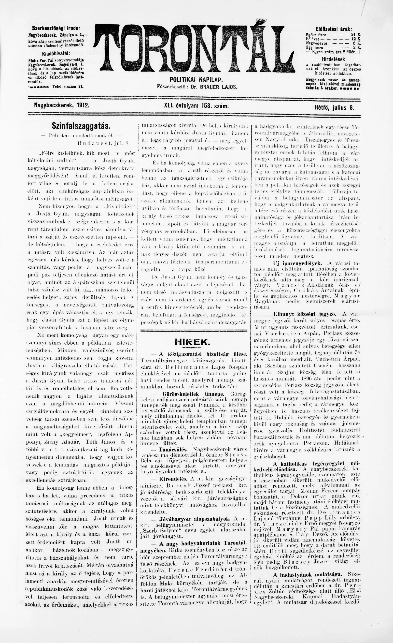 Torontál, 41. évf. 1912. július 8. 153. sz.