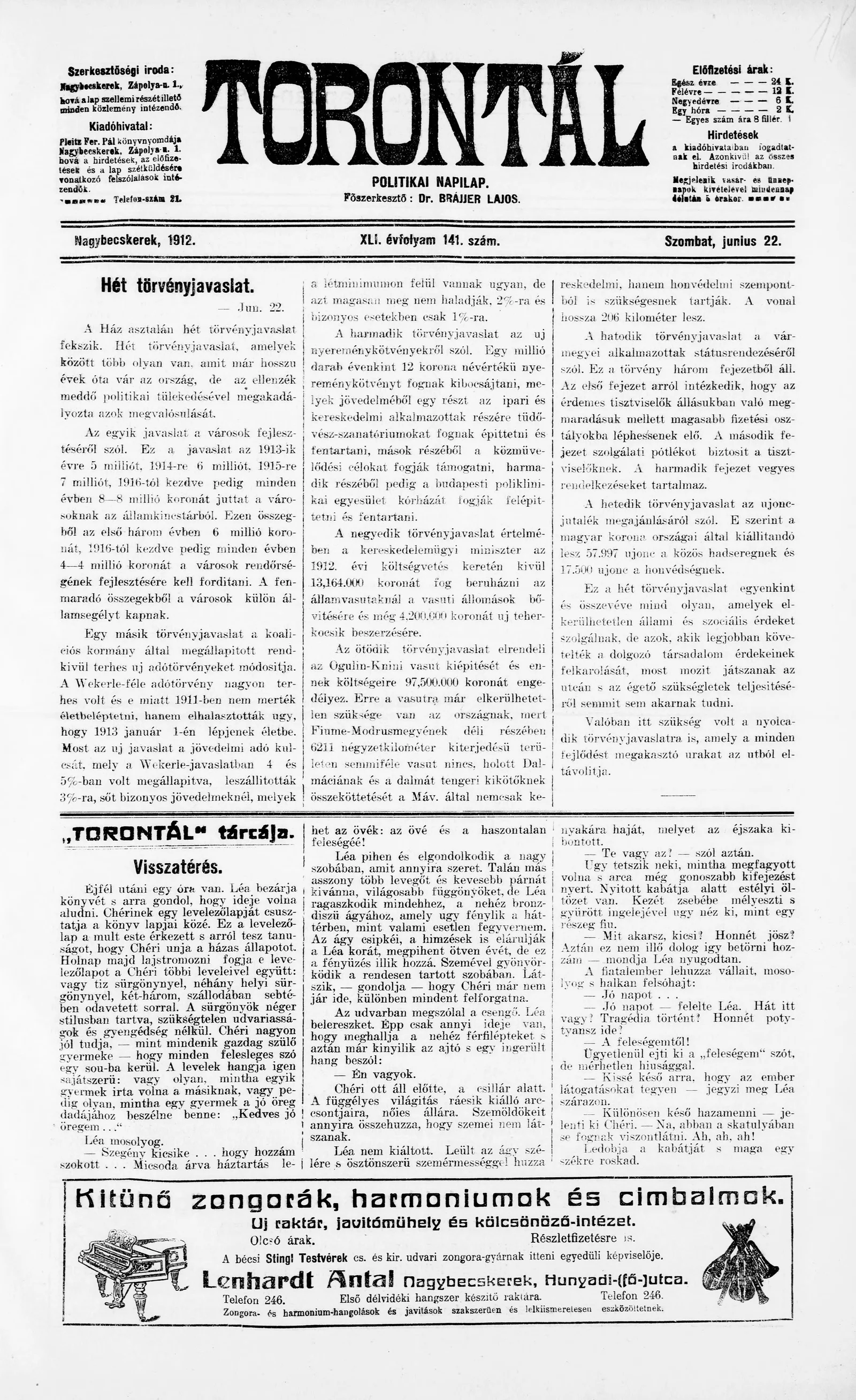 Torontál, 41. évf. 1912. június 22. 141. sz.