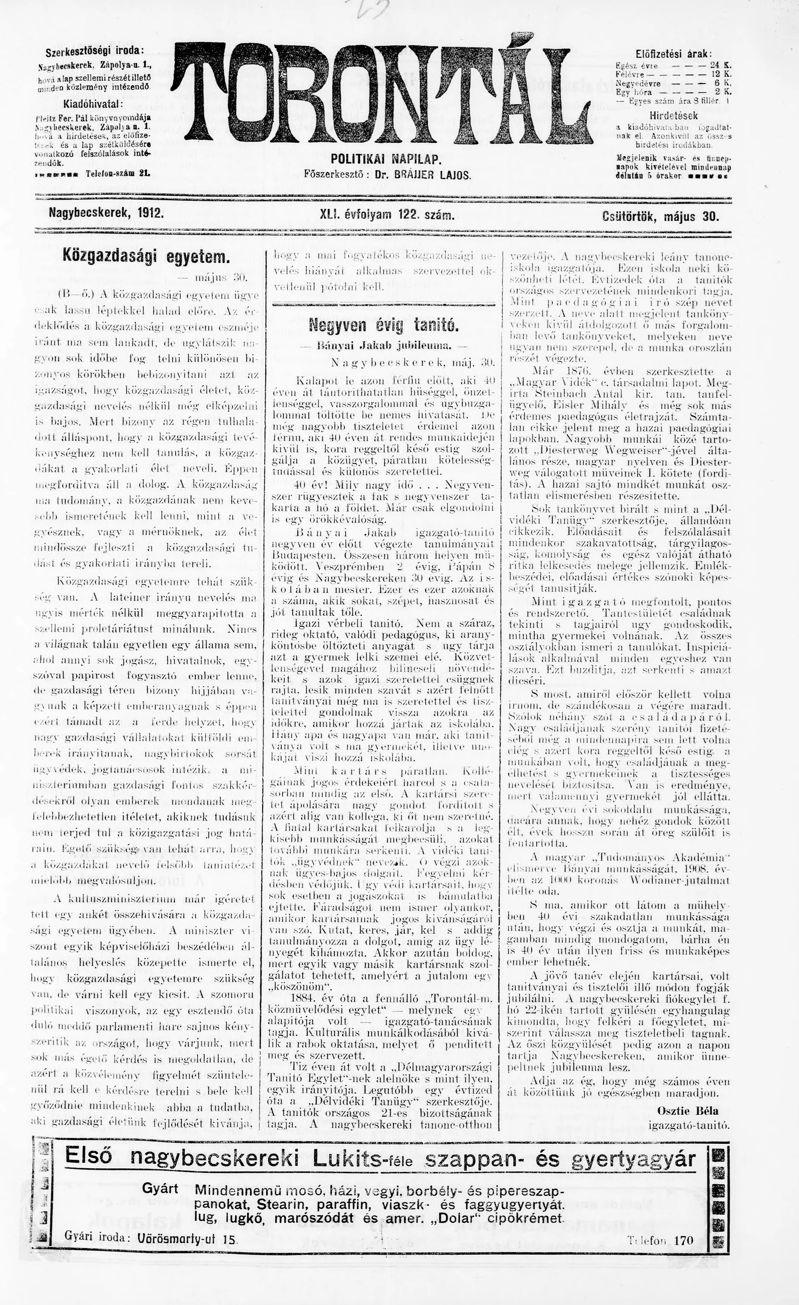 Torontál, 41. évf. 1912. május 30. 122. sz.