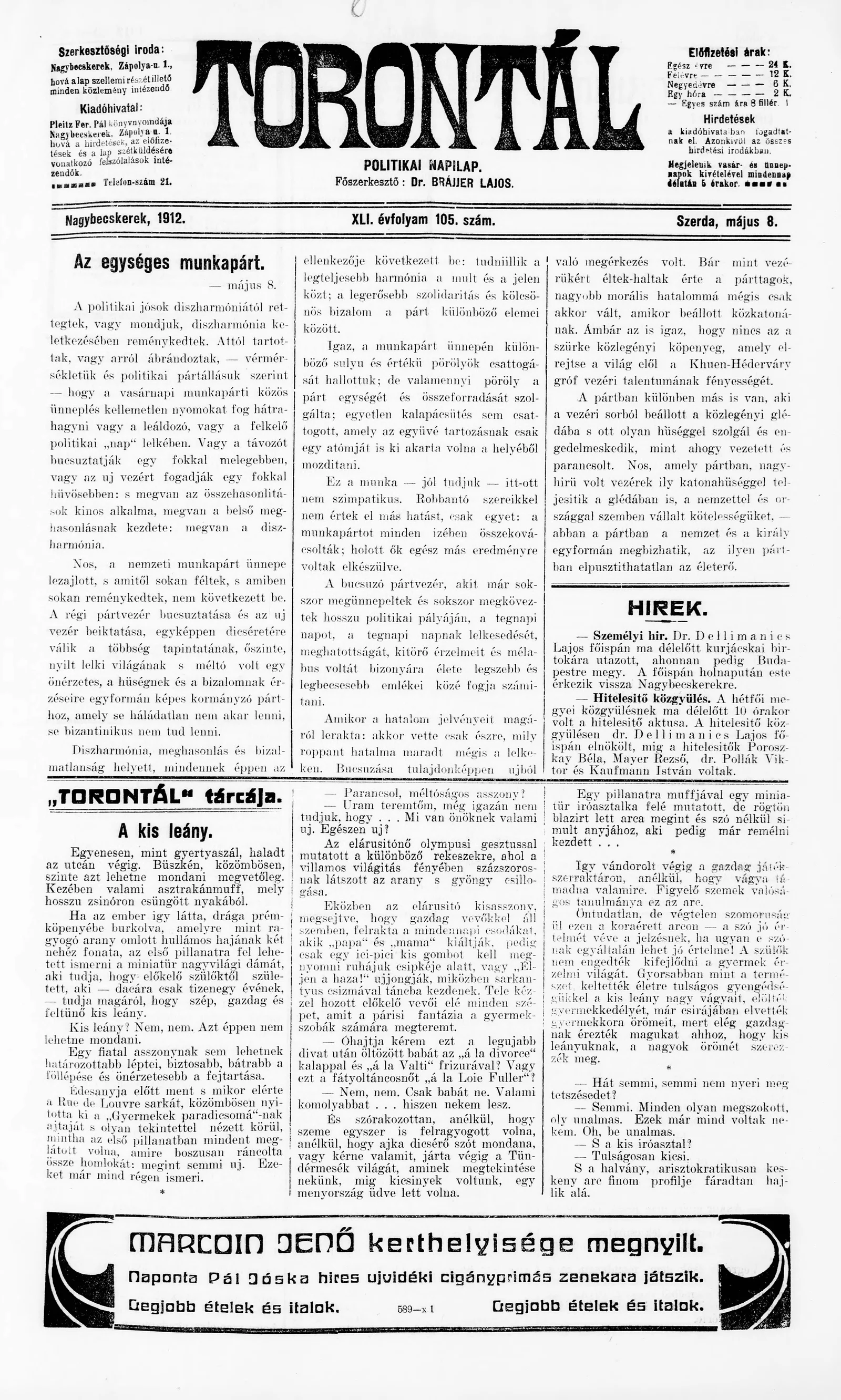 Torontál, 41. évf. 1912. május 8. 105. sz.