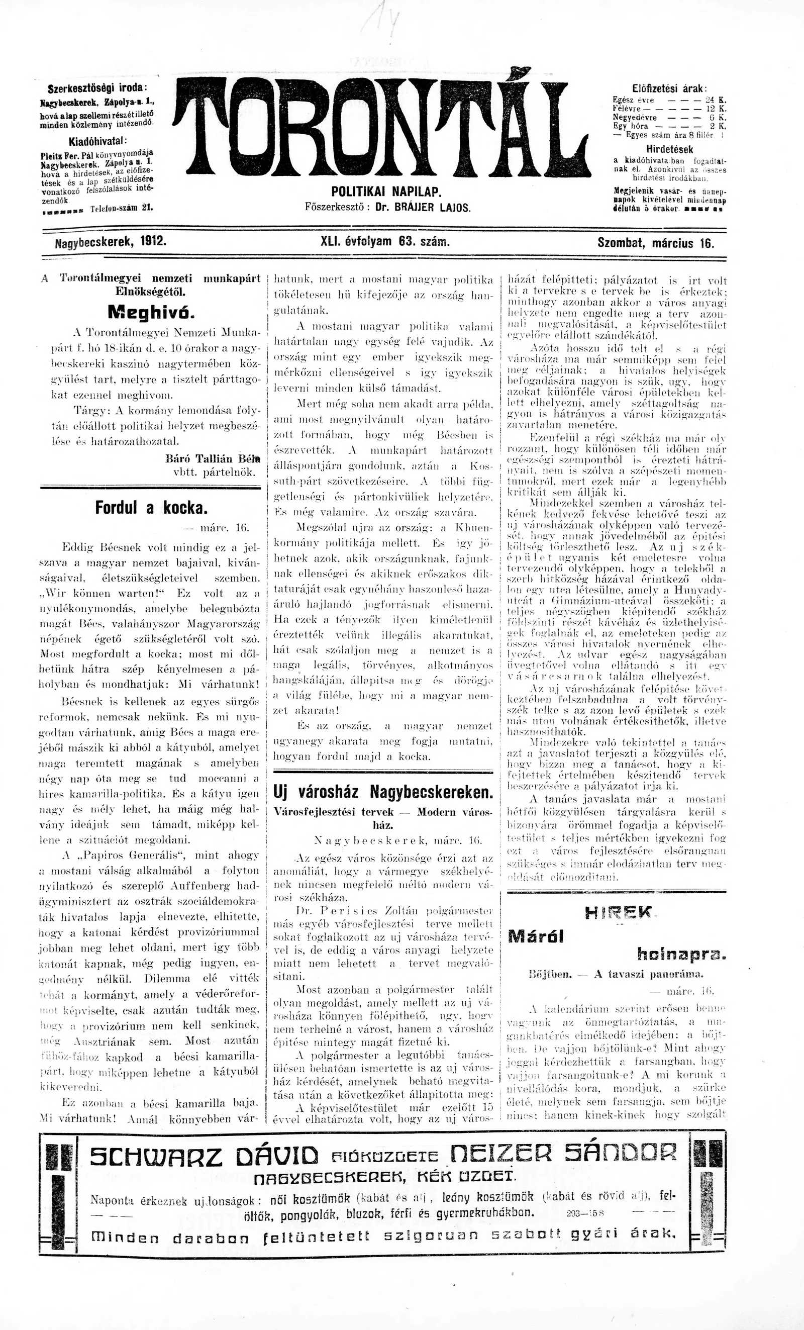 Torontál, 41. évf. 1912. március 16. 63. sz.