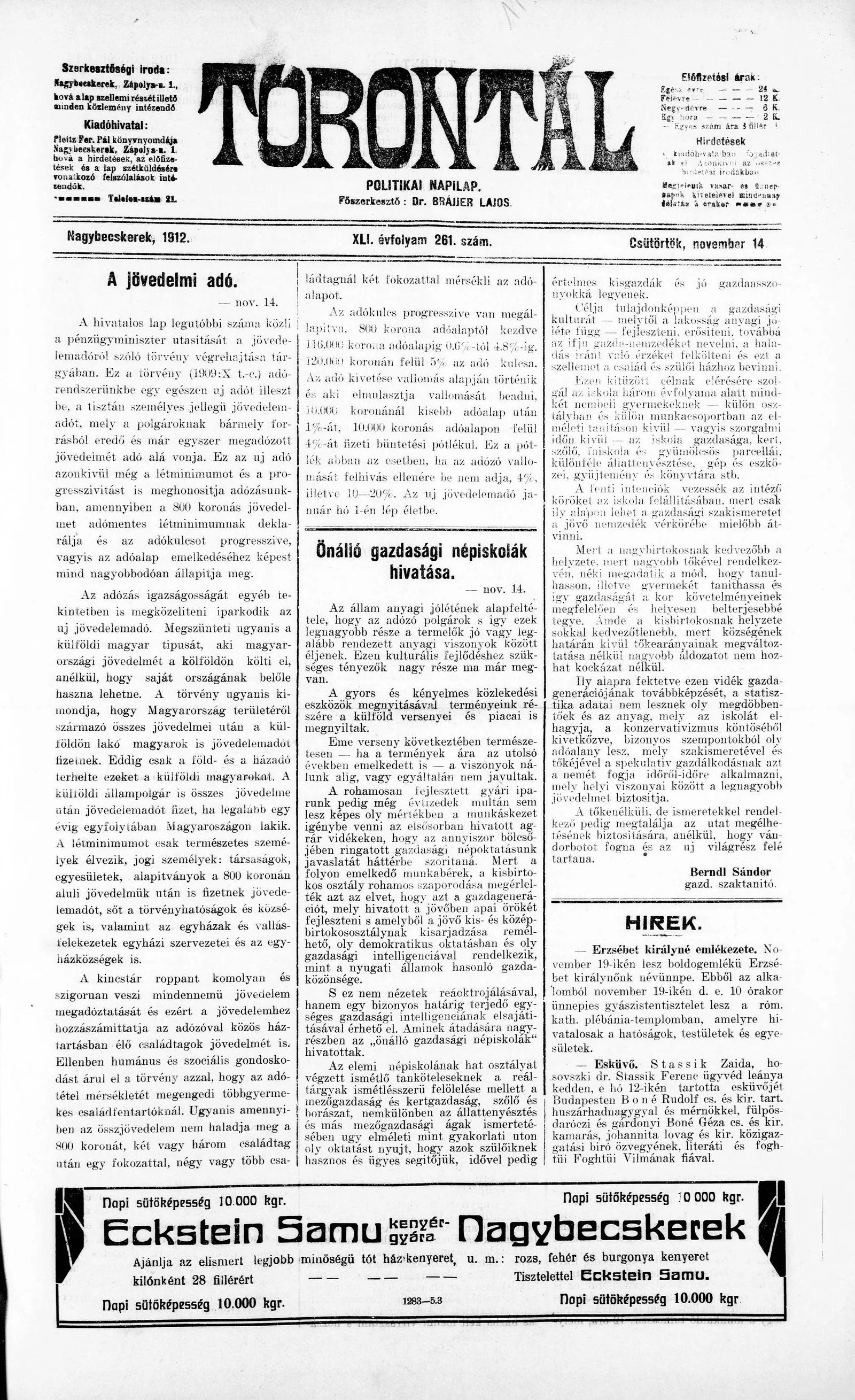 Torontál, 41. évf. 1912. november 14. 261. sz.