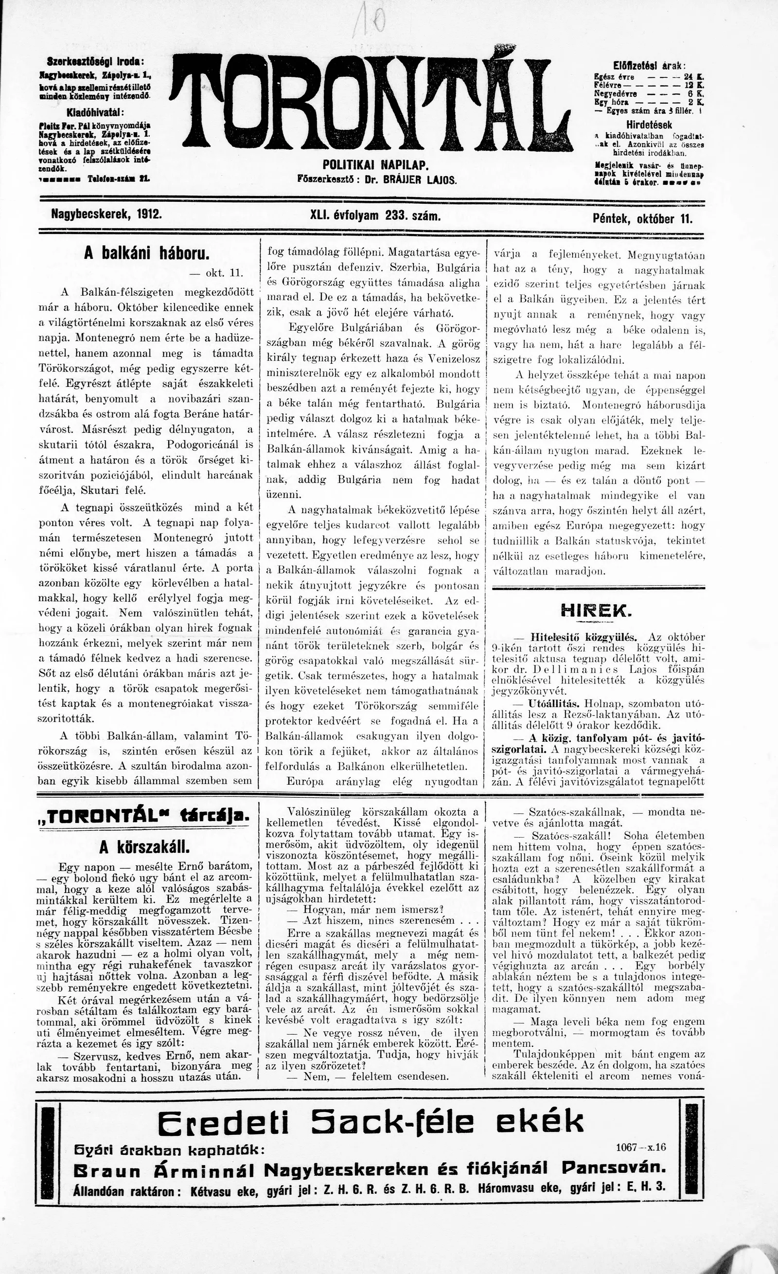 Torontál, 41. évf. 1912. október 11. 233. sz.