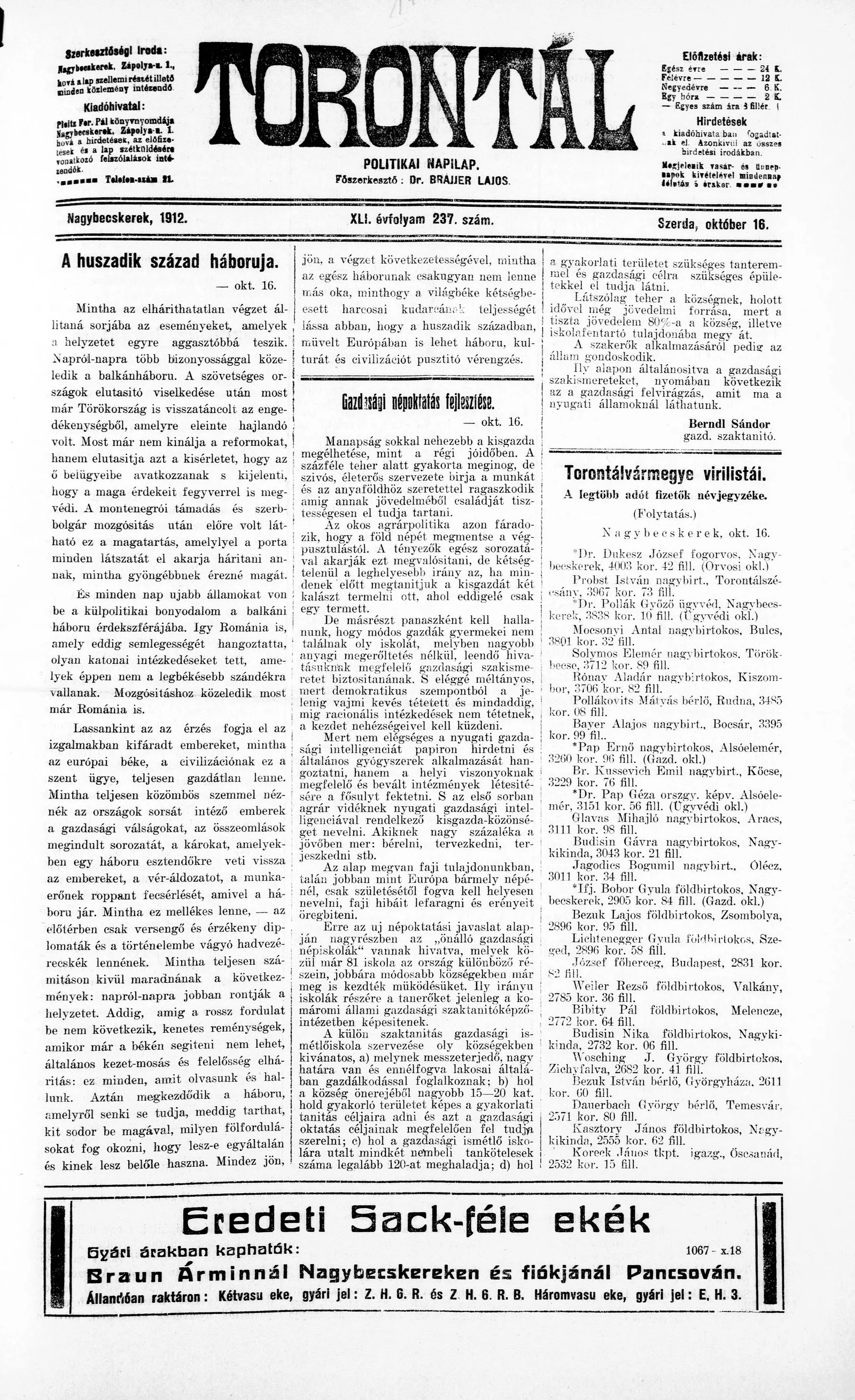 Torontál, 41. évf. 1912. október 16. 237. sz.
