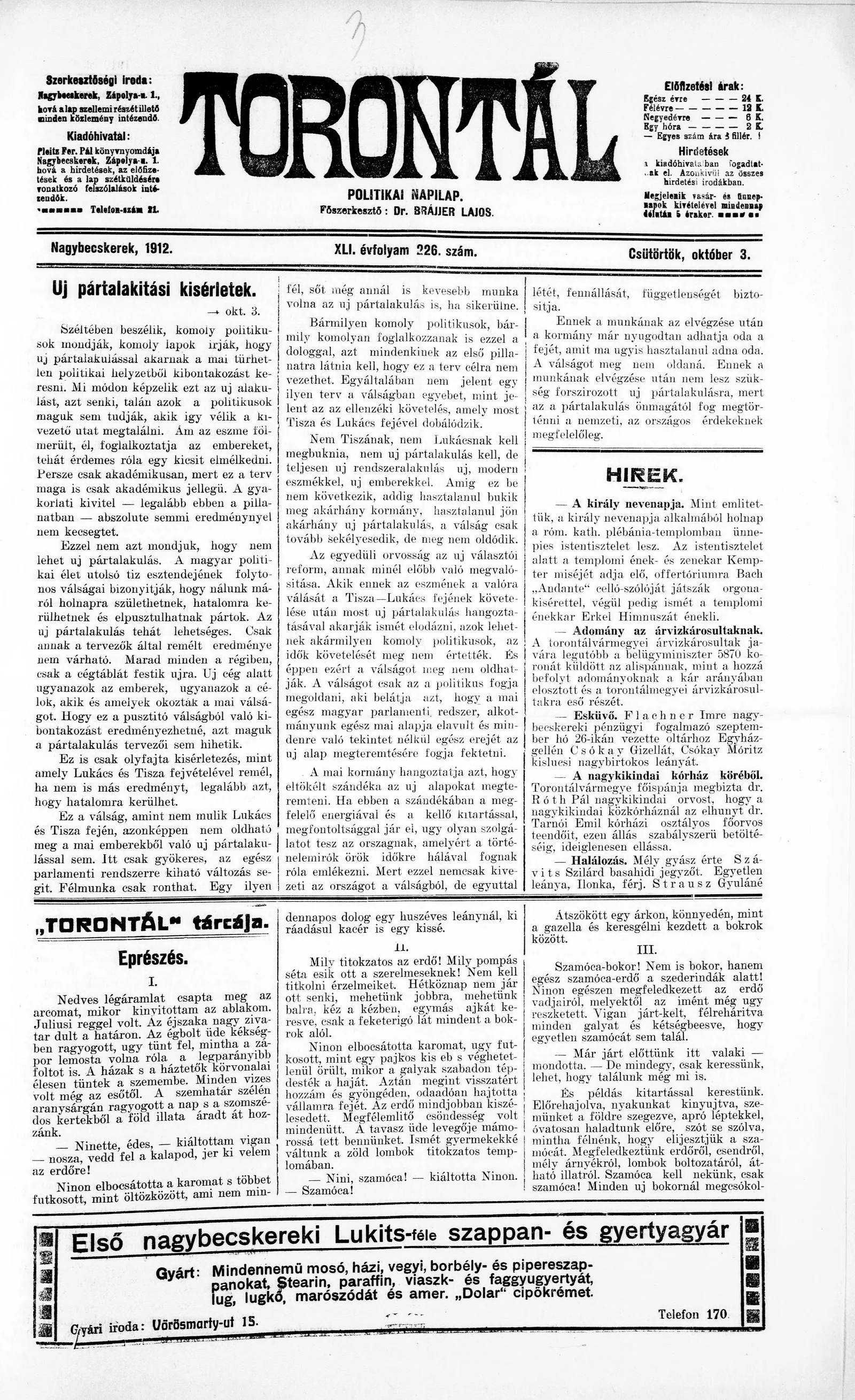 Torontál, 41. évf. 1912. október 3. 226. sz.