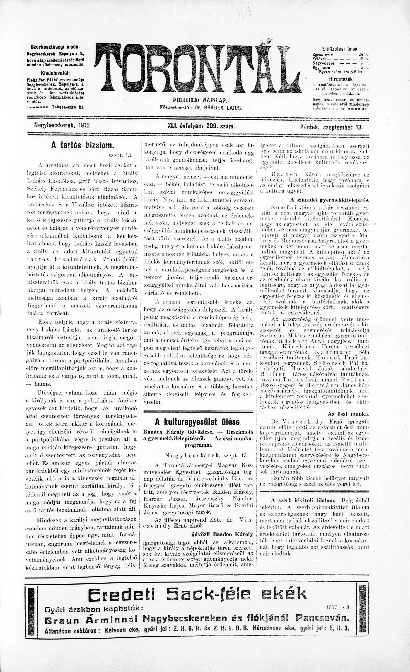 Torontál, 41. évf. 1912. szeptember 13. 209. sz.