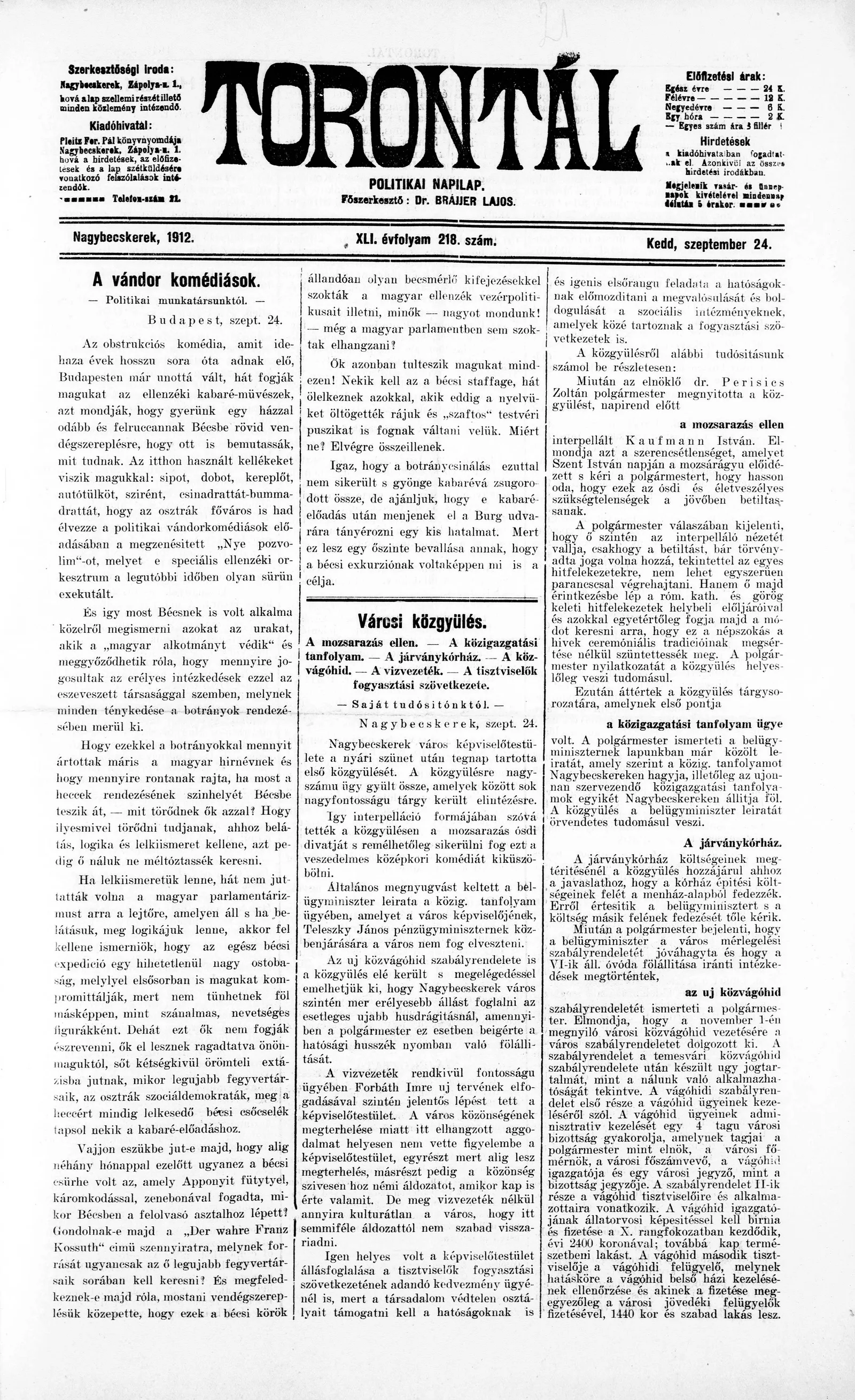 Torontál, 41. évf. 1912. szeptember 24. 218. sz.
