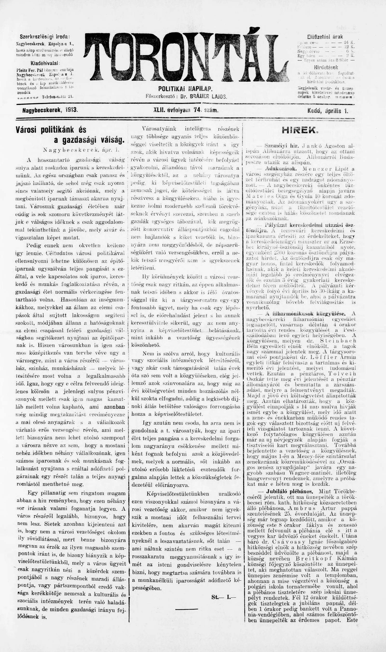 Torontál, 42. évf. 1913. április 1. 74. sz.