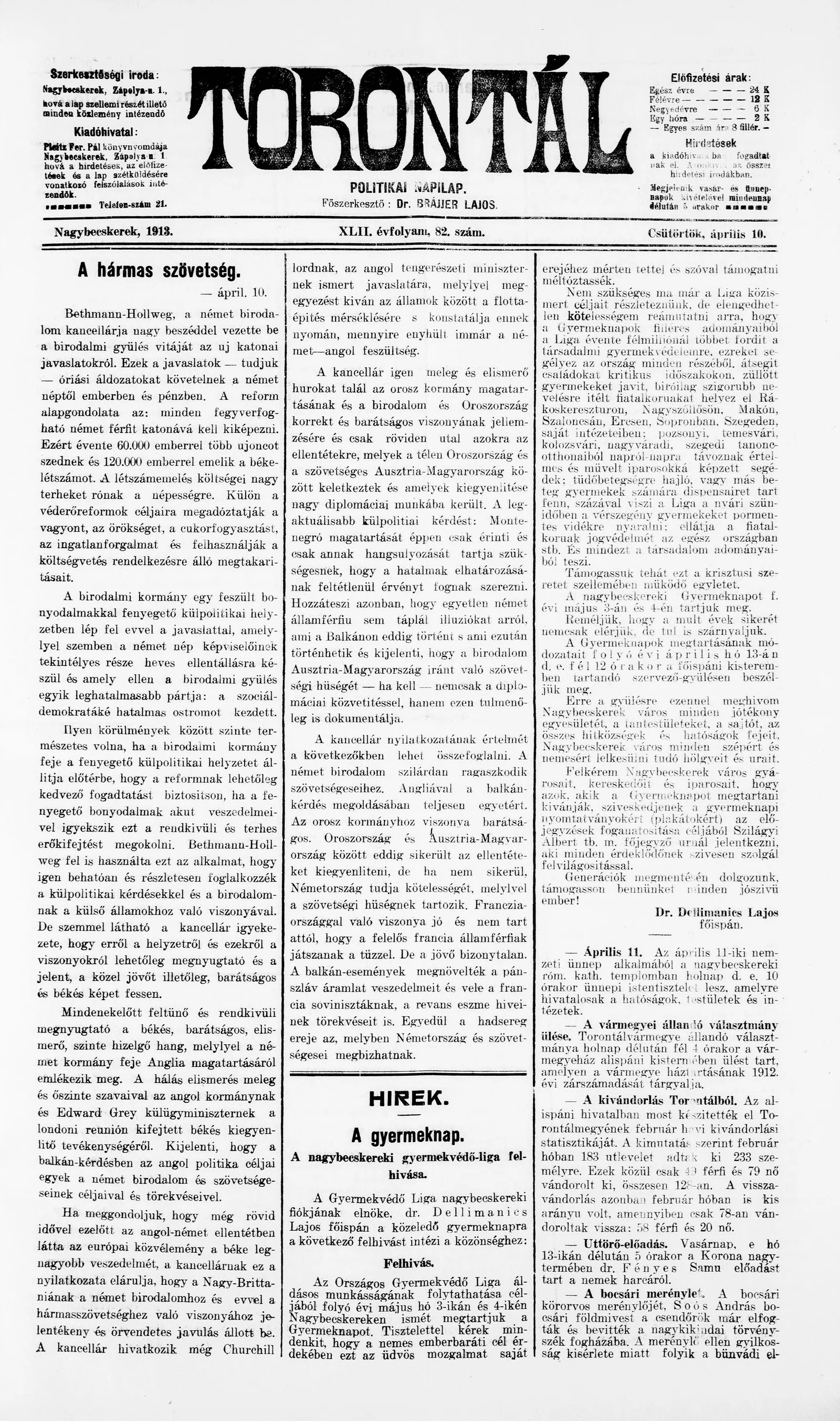 Torontál, 42. évf. 1913. április 10. 82. sz.