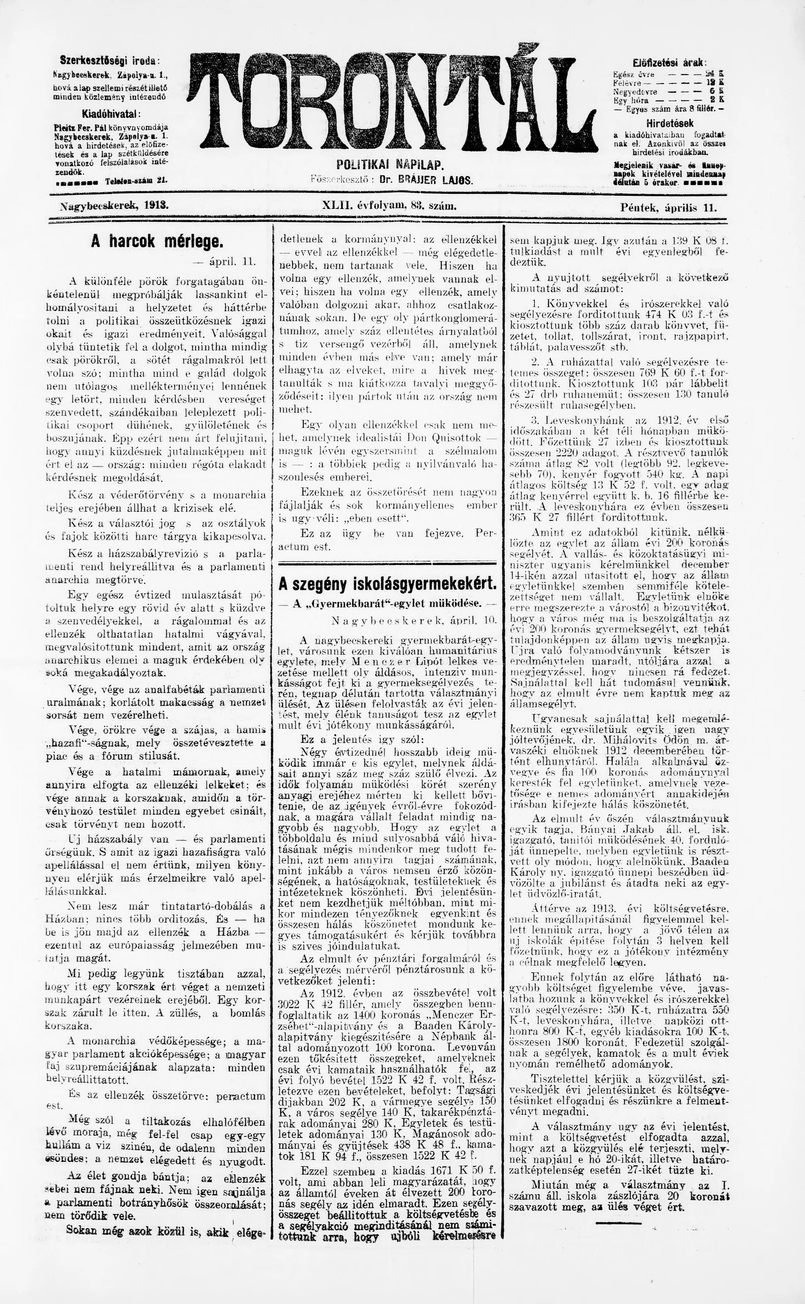 Torontál, 42. évf. 1913. április 11. 83. sz.