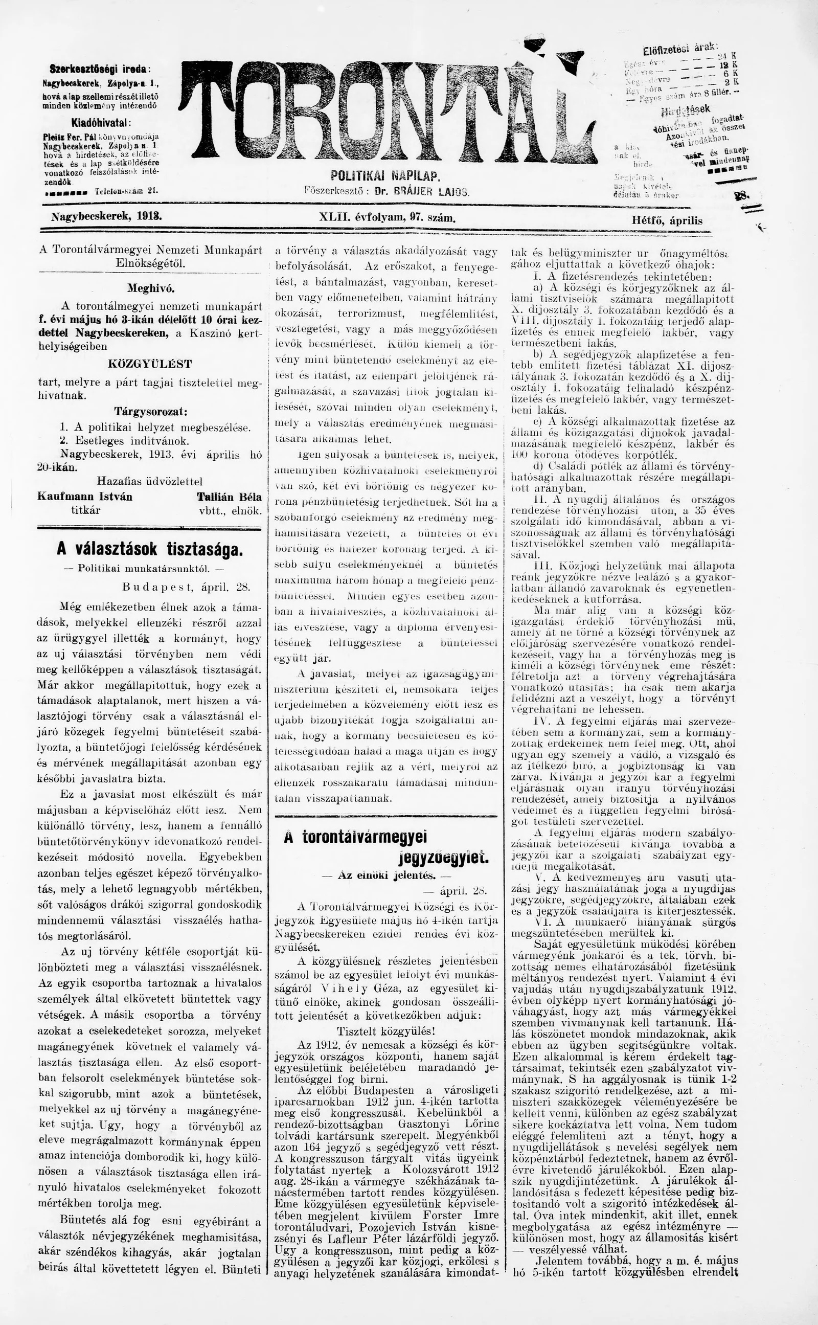 Torontál, 42. évf. 1913. április 28. 97. sz.