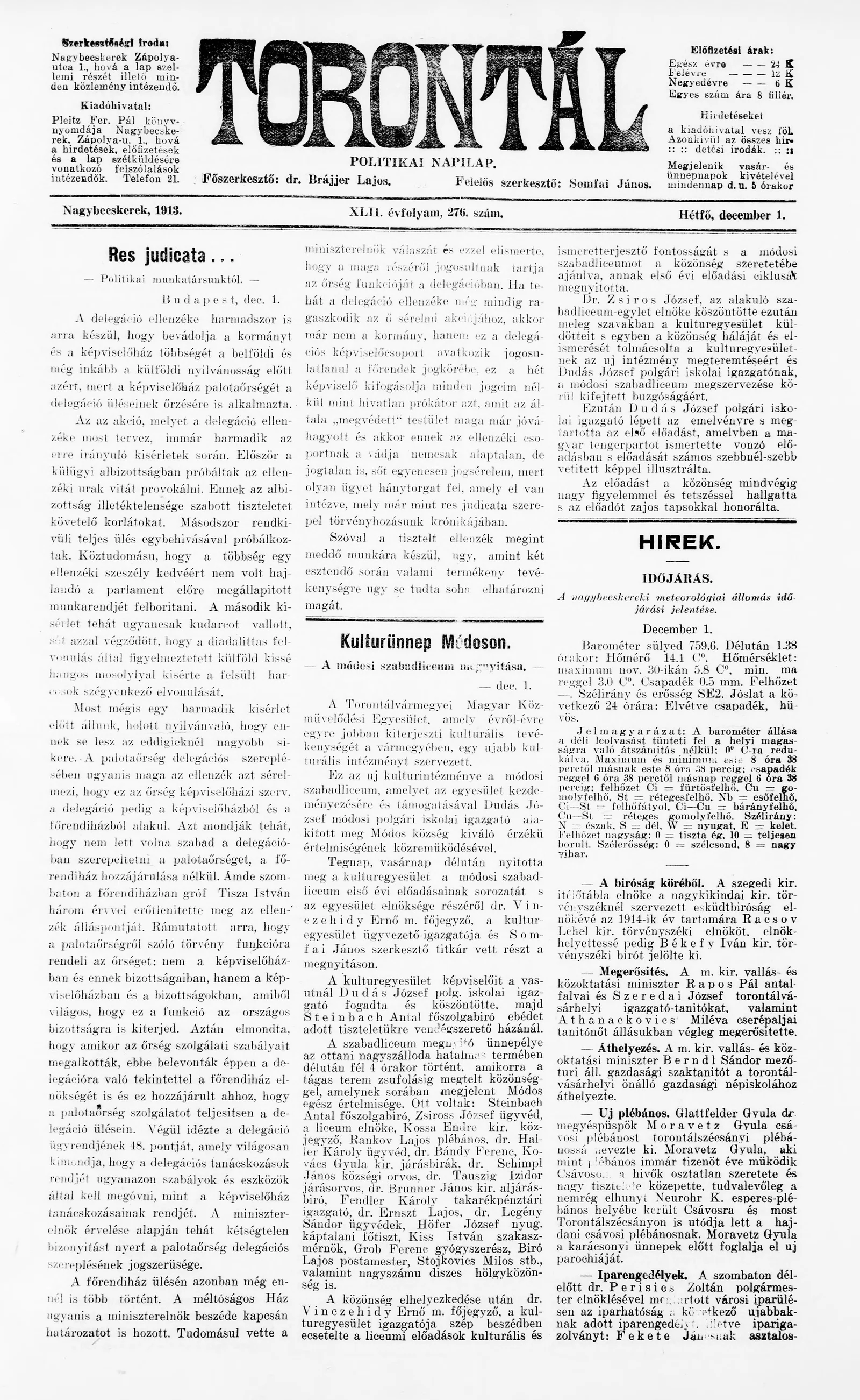 Torontál, 42. évf. 1913. december 1. 276. sz.