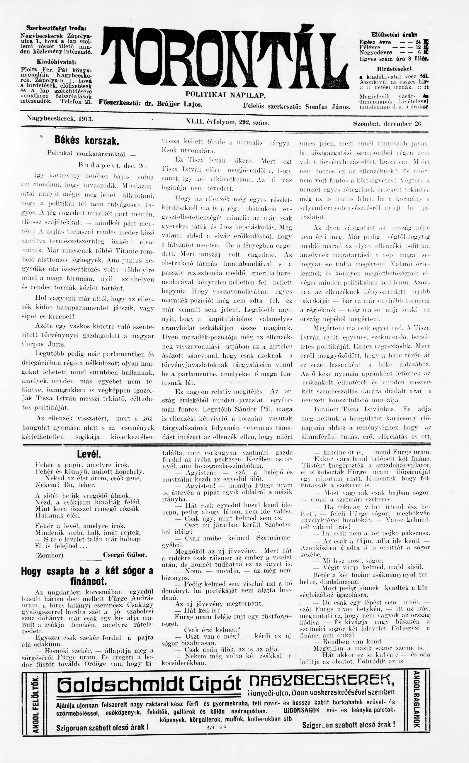 Torontál, 42. évf. 1913. december 20. 292. sz.