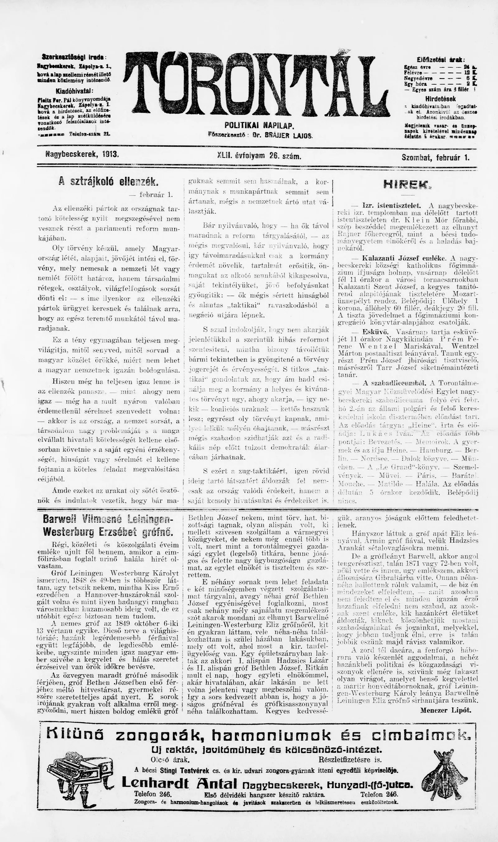 Torontál, 42. évf. 1913. február 1. 26. sz.