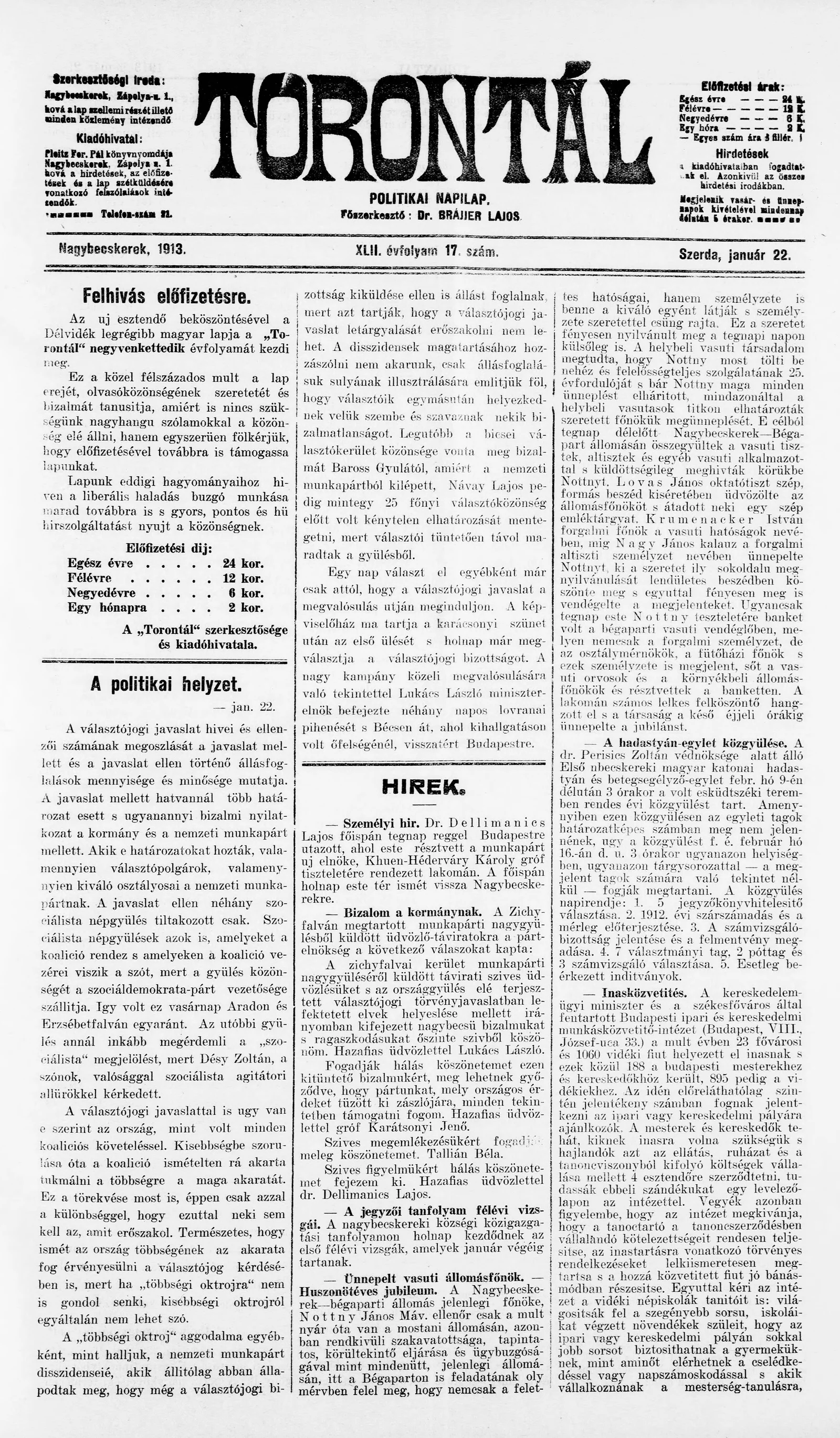 Torontál, 42. évf. 1913. január 22. 17. sz.