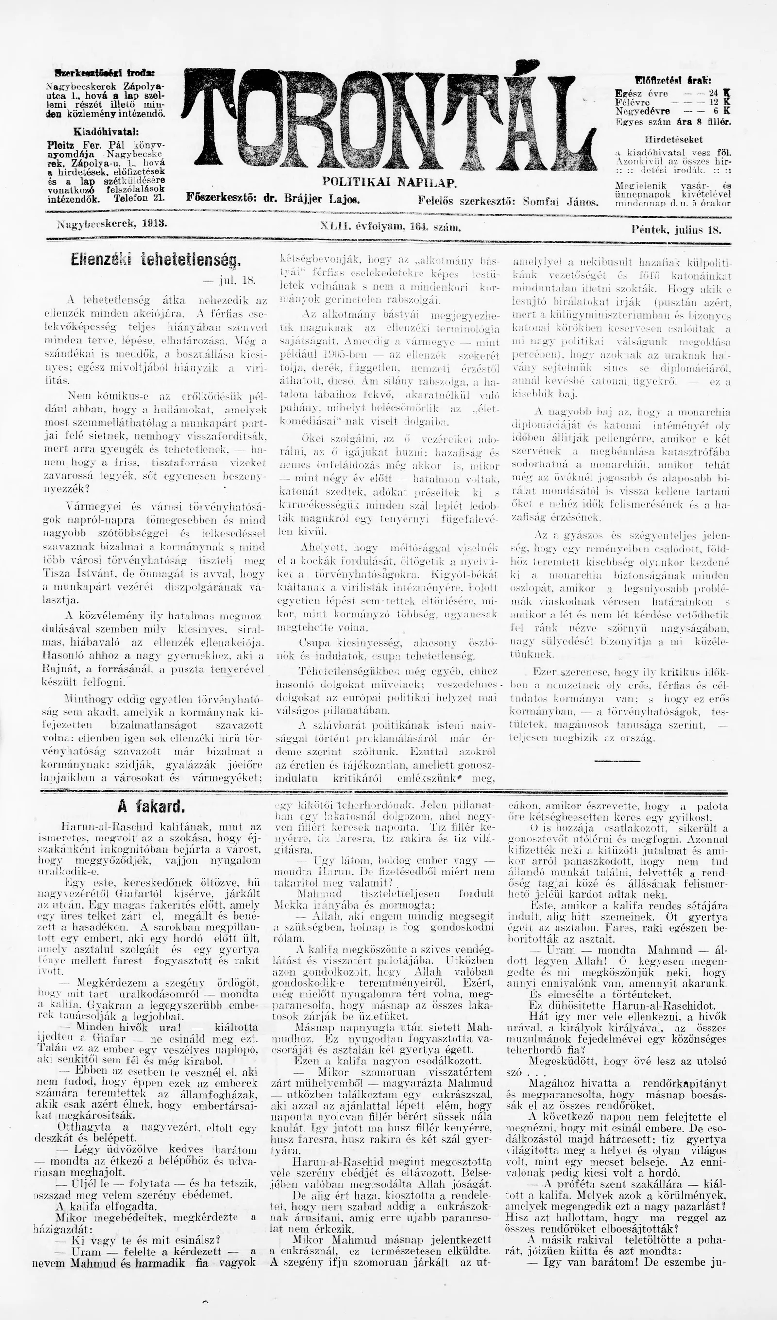 Torontál, 42. évf. 1913. július 18. 164. sz.