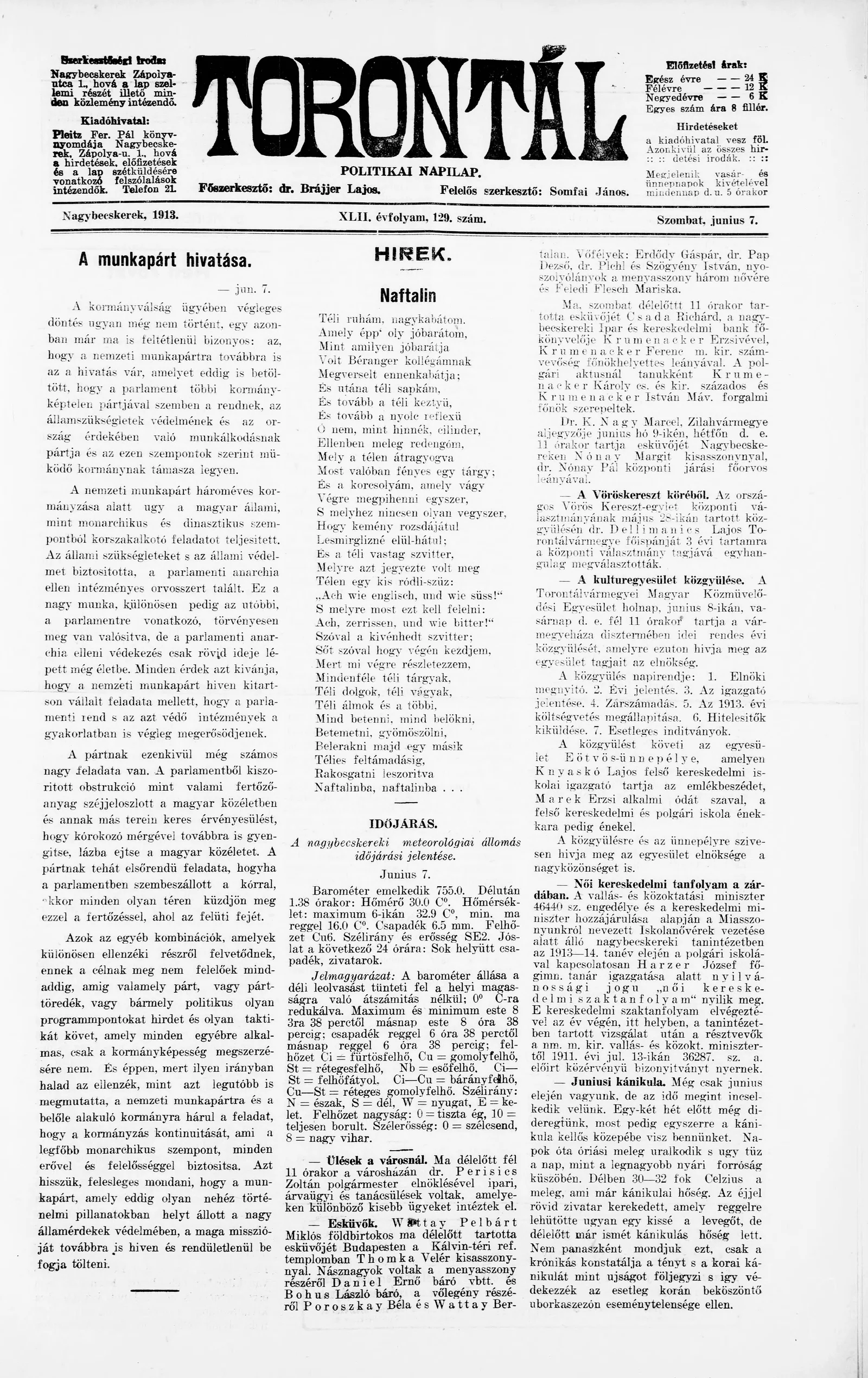 Torontál, 42. évf. 1913. június 7. 129. sz.
