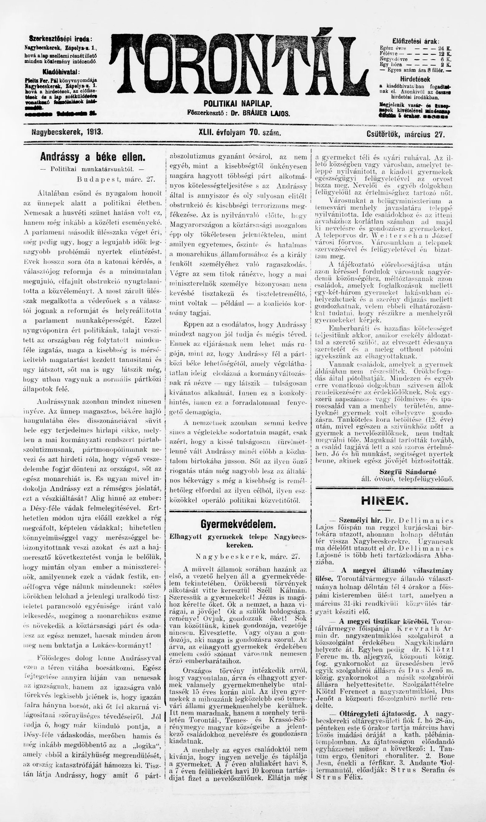 Torontál, 42. évf. 1913. március 27. 70. sz.