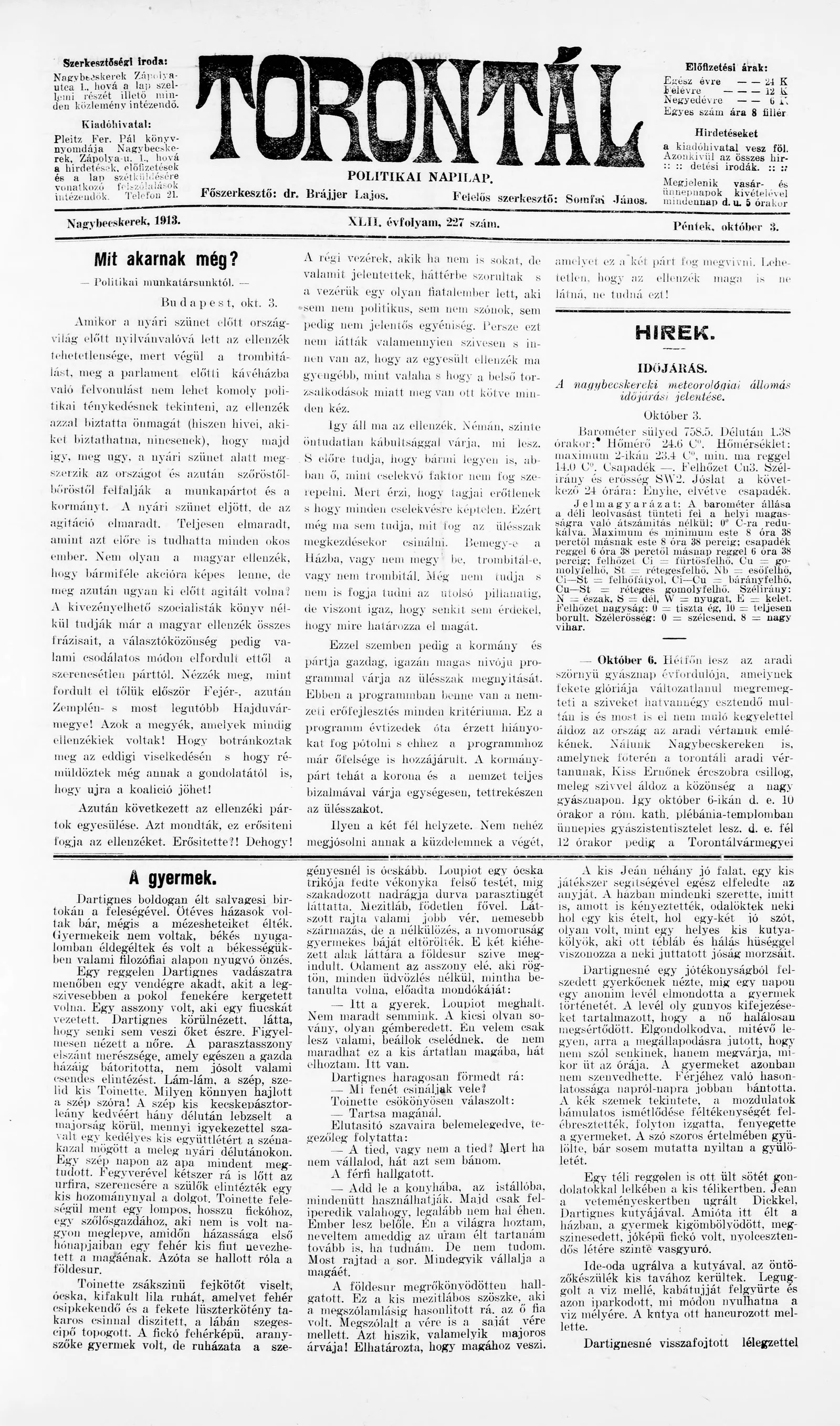 Torontál, 42. évf. 1913. október 3. 227. sz.
