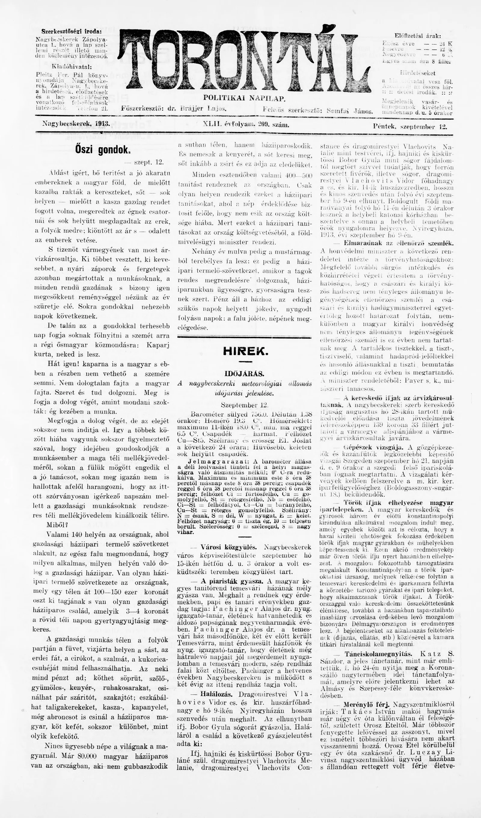 Torontál, 42. évf. 1913. szeptember 12. 209. sz.