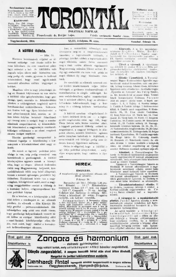 Torontál, 43. évf. 1914. február 14. 36. sz.