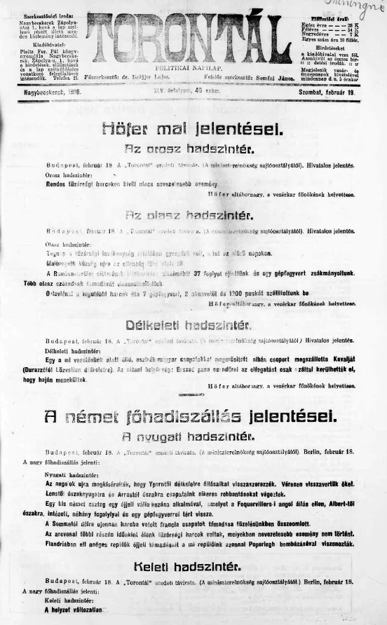 Torontál, 45. évf. 1916. február 19. 40. sz.