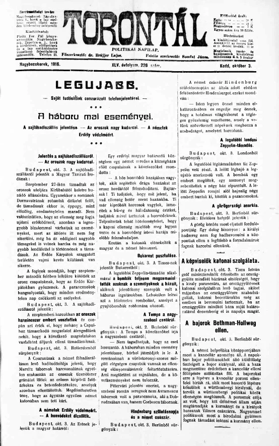 Torontál, 45. évf. 1916. október 3. 226. sz.