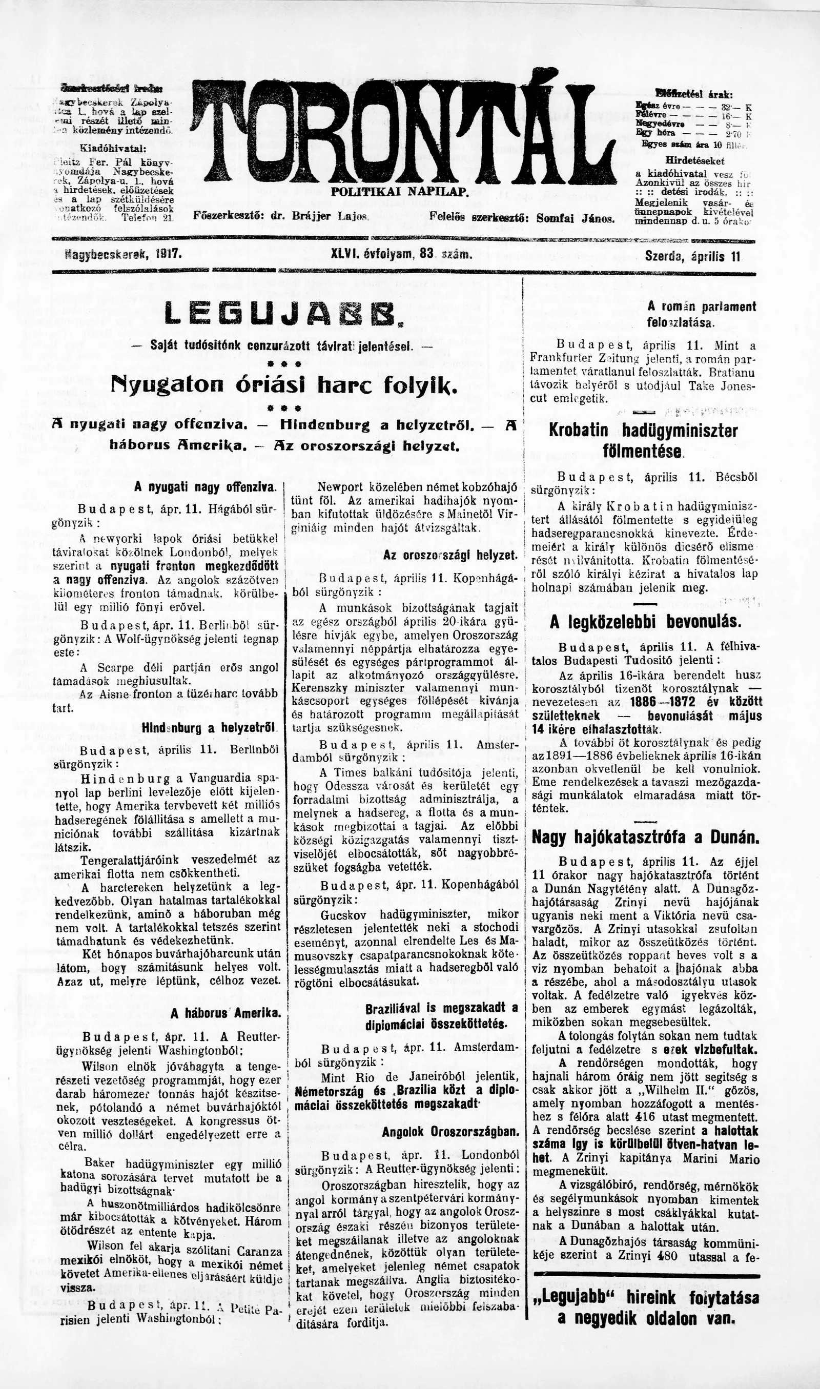 Torontál, 46. évf. 1917. április 11. 83. sz.