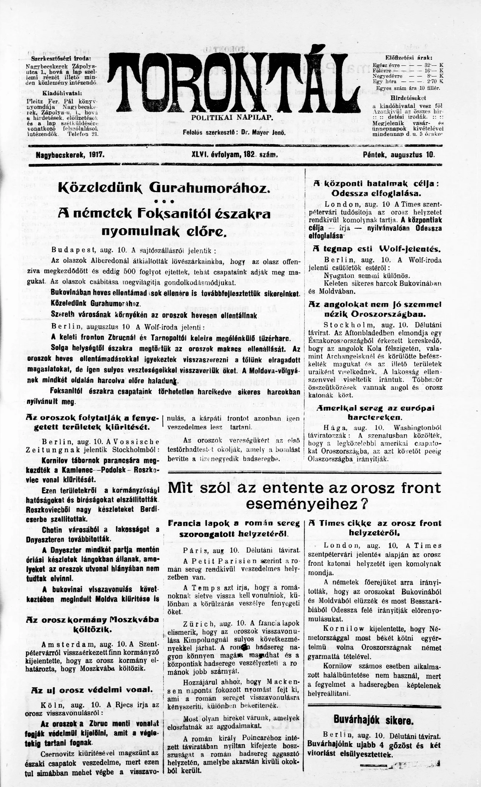 Torontál, 46. évf. 1917. augusztus 10. 182. sz.