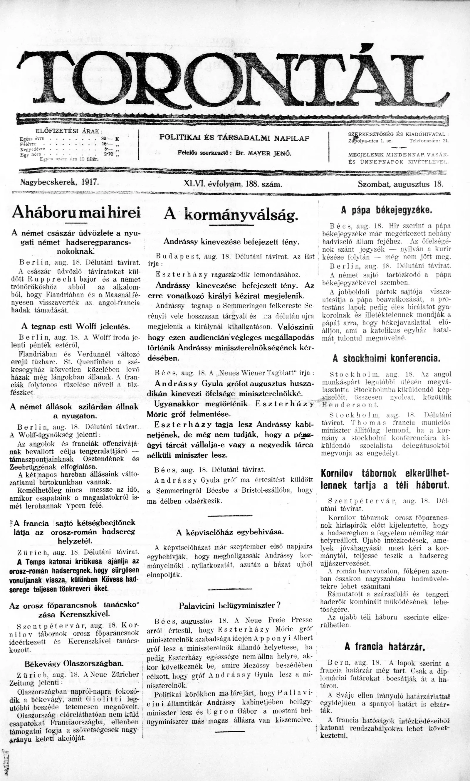 Torontál, 46. évf. 1917. augusztus 18. 188. sz.