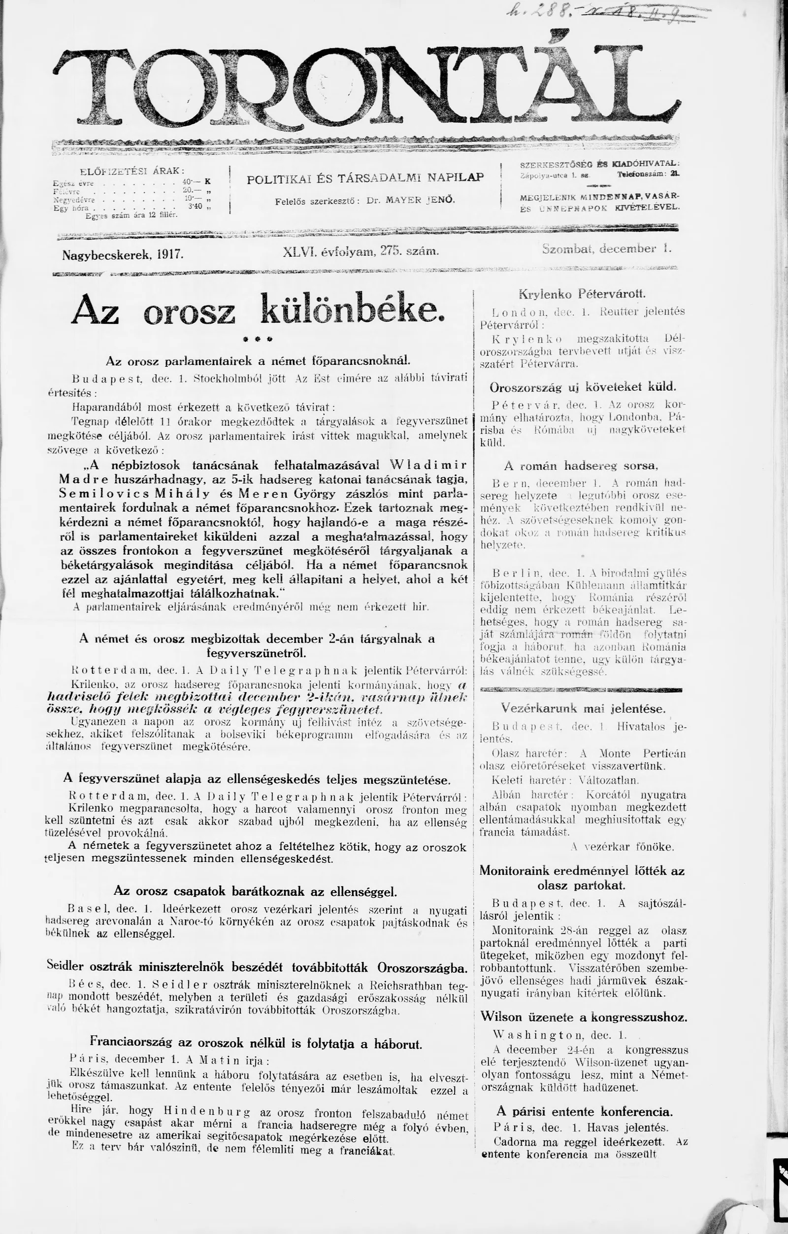Torontál, 46. évf. 1917. december 1. 275. sz.