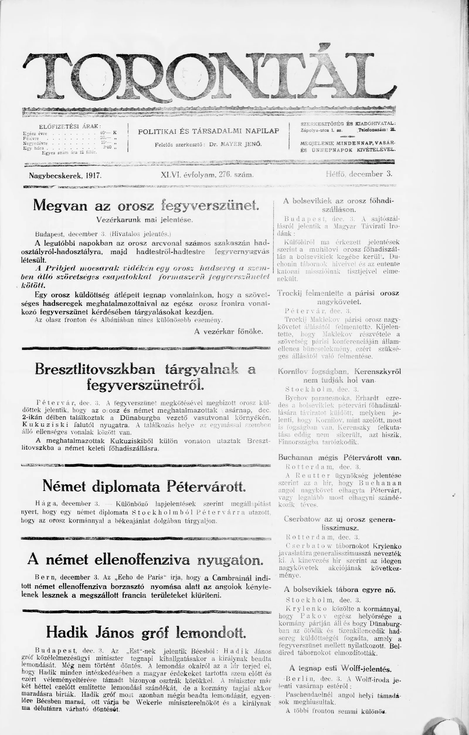 Torontál, 46. évf. 1917. december 3. 276. sz.