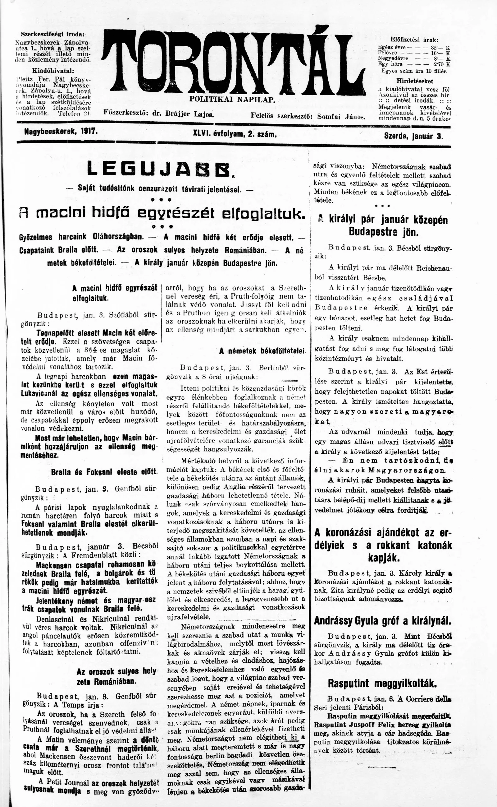 Torontál, 46. évf. 1917. január 3. 2. sz.