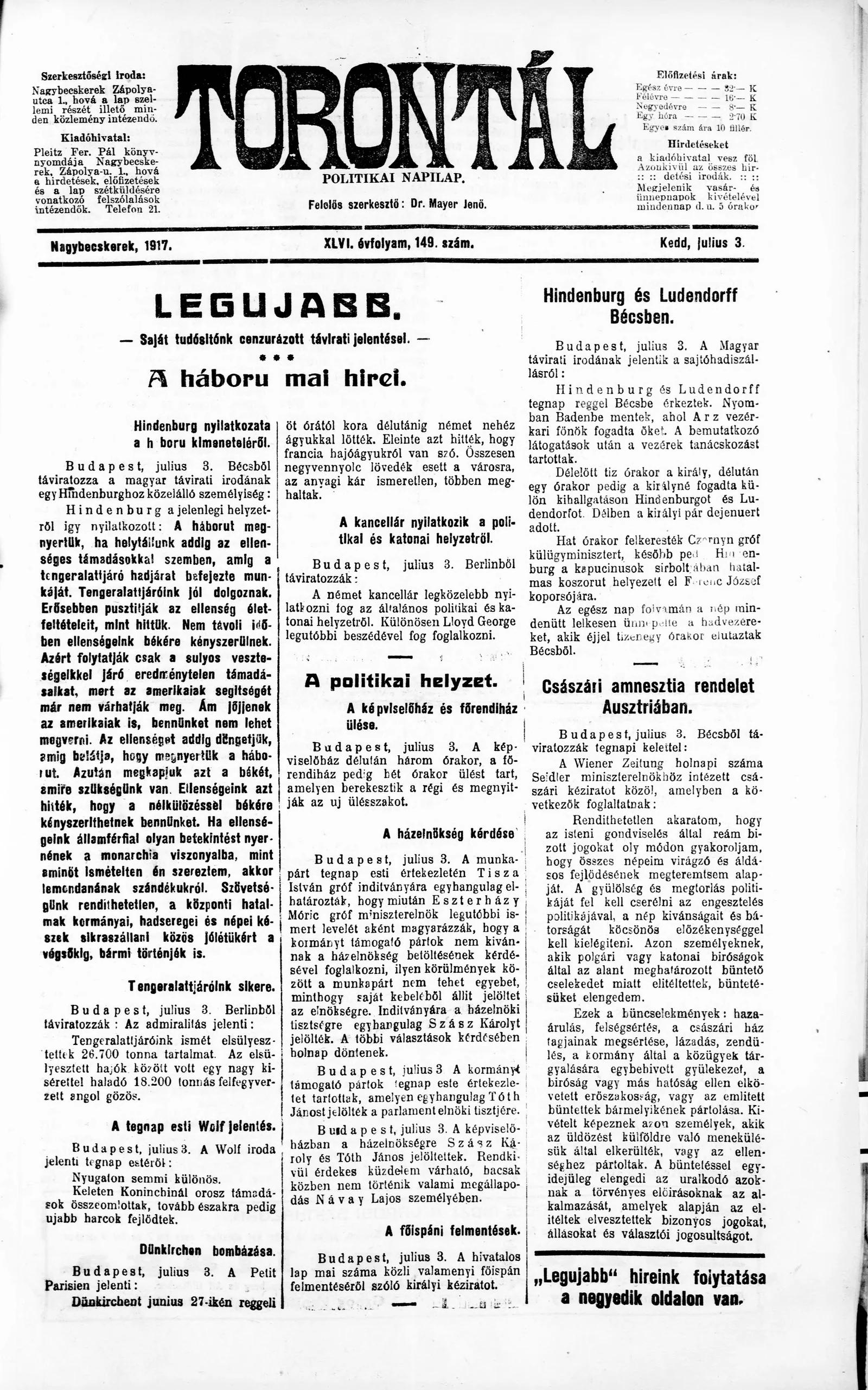 Torontál, 46. évf. 1917. július 3. 149. sz.