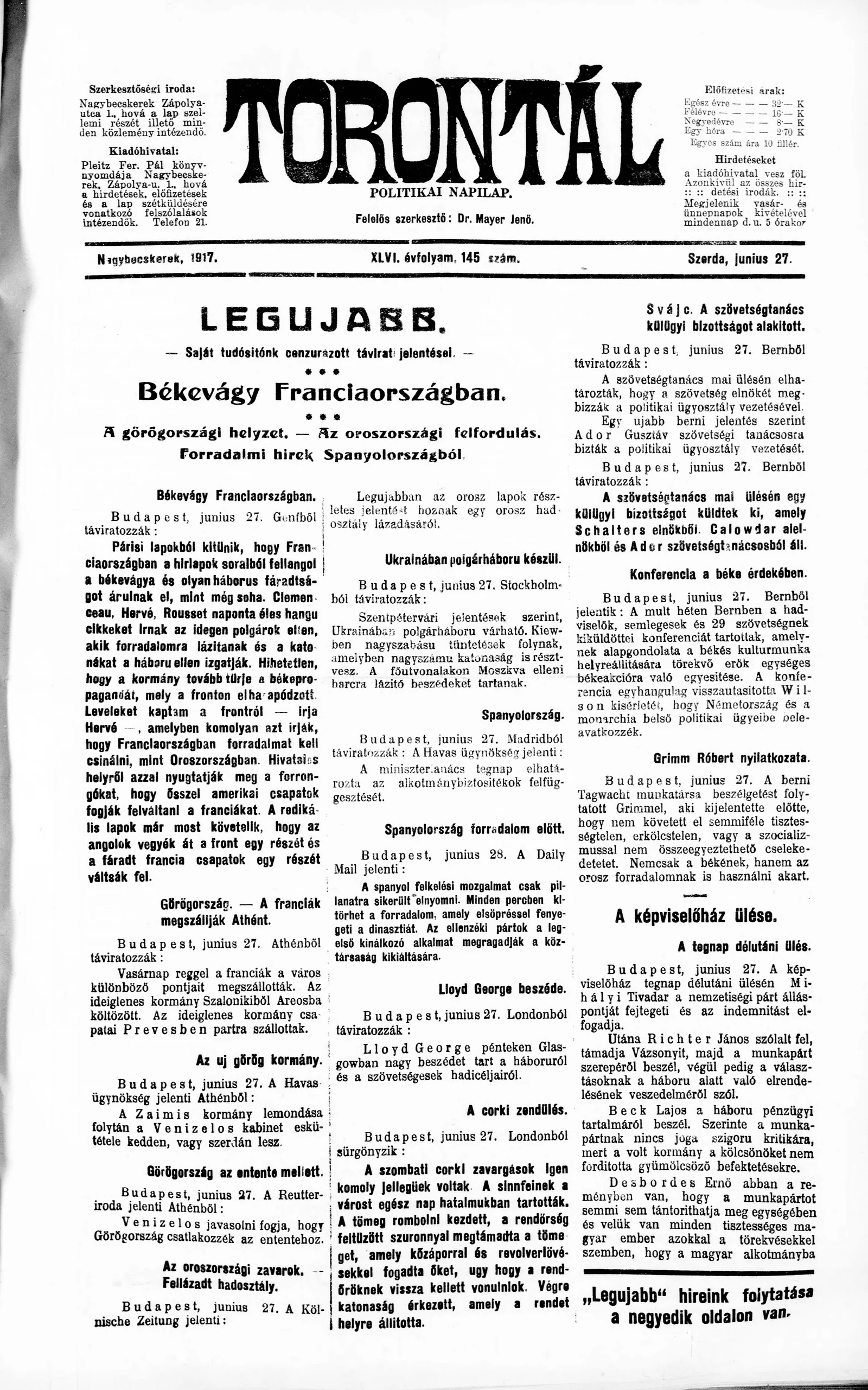 Torontál, 46. évf. 1917. június 27. 145. sz.