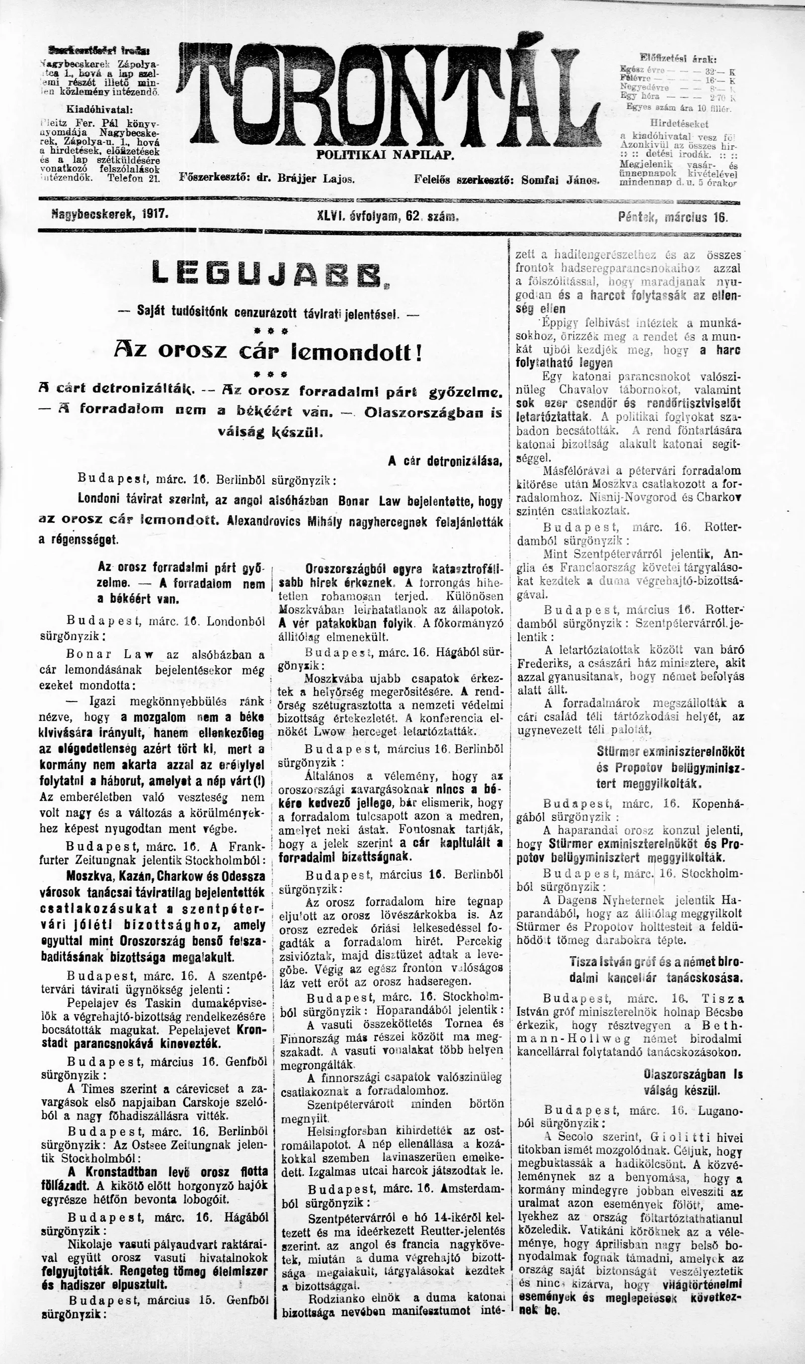 Torontál, 46. évf. 1917. március 16. 62. sz.