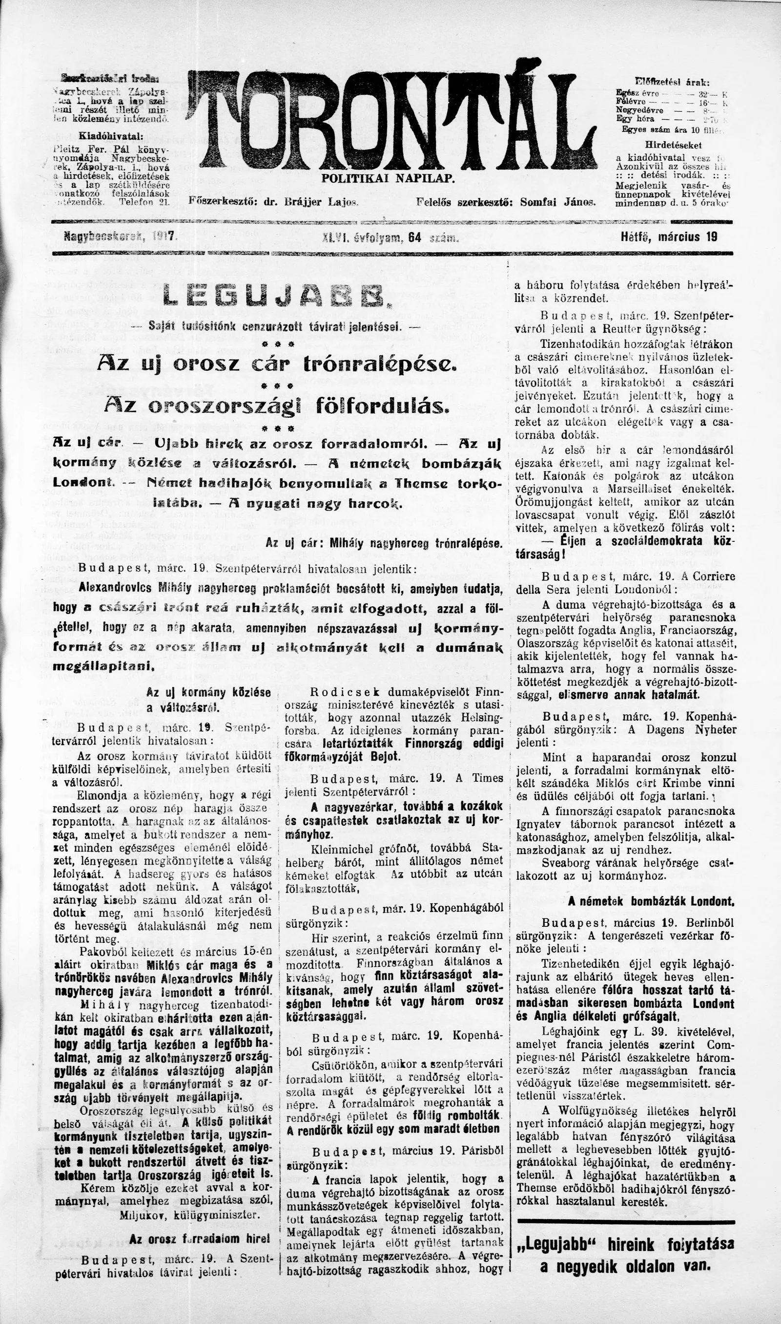 Torontál, 46. évf. 1917. március 19. 64. sz.