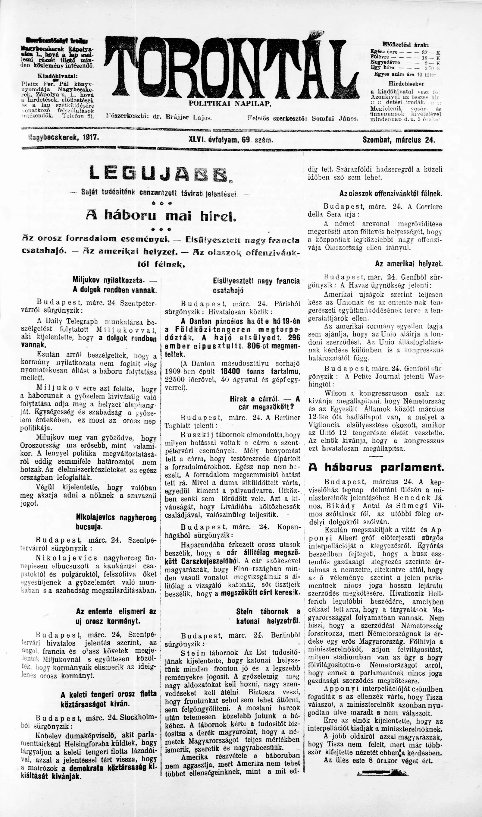 Torontál, 46. évf. 1917. március 24. 69. sz.