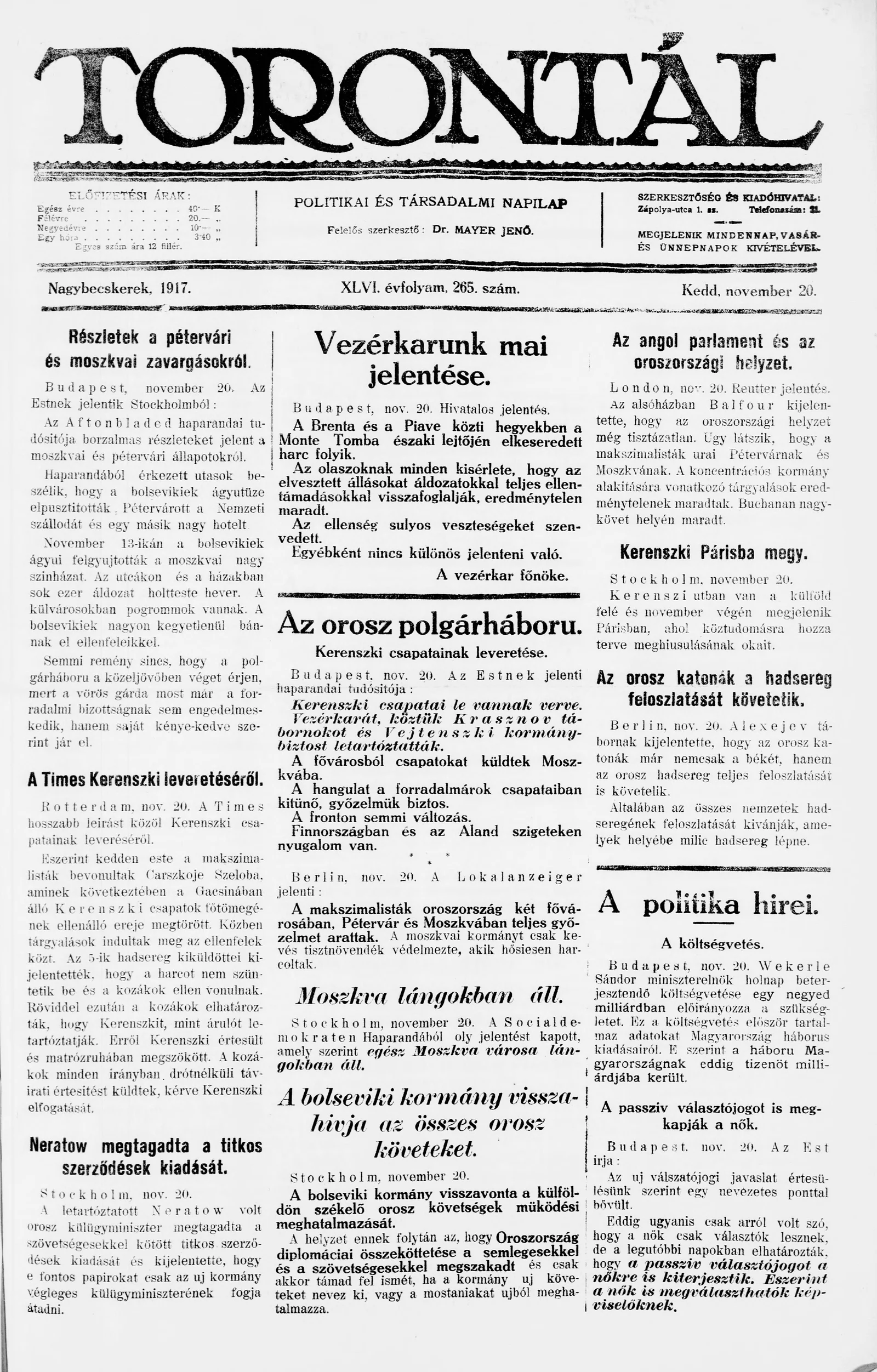 Torontál, 46. évf. 1917. november 20. 265. sz.