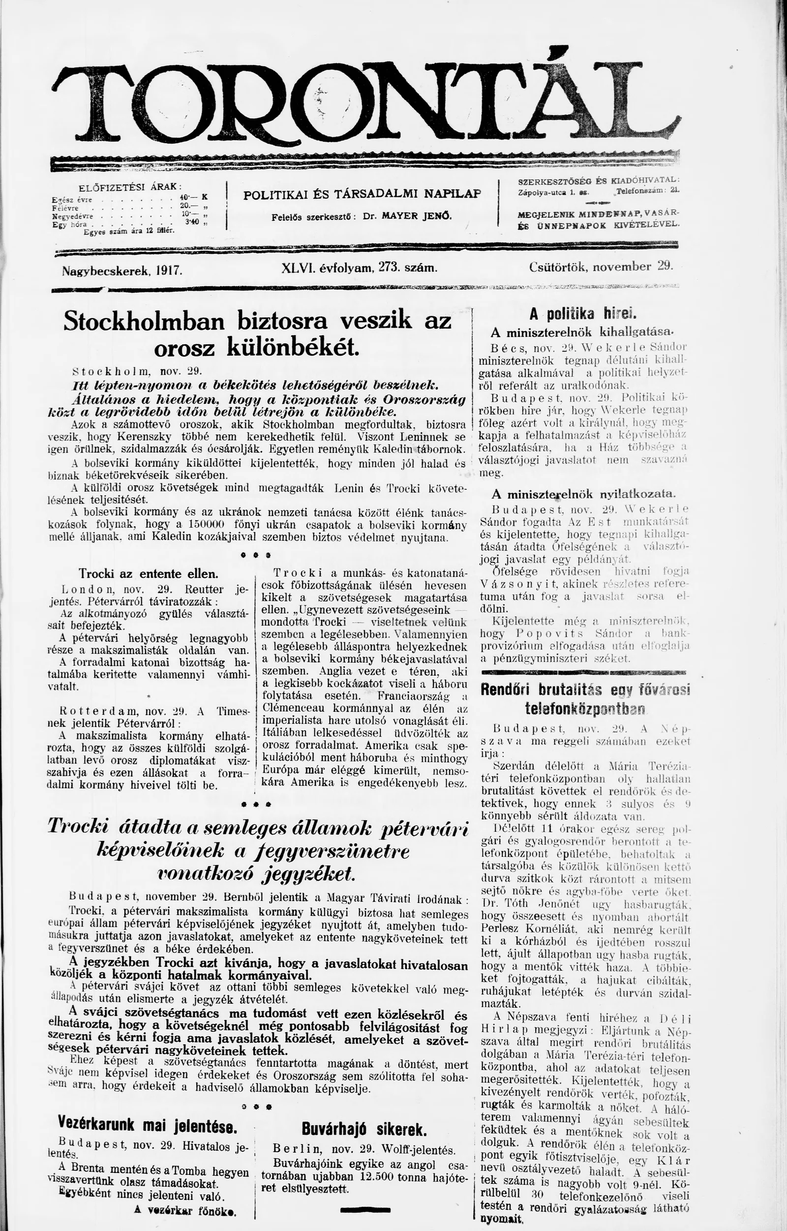 Torontál, 46. évf. 1917. november 29. 273. sz.